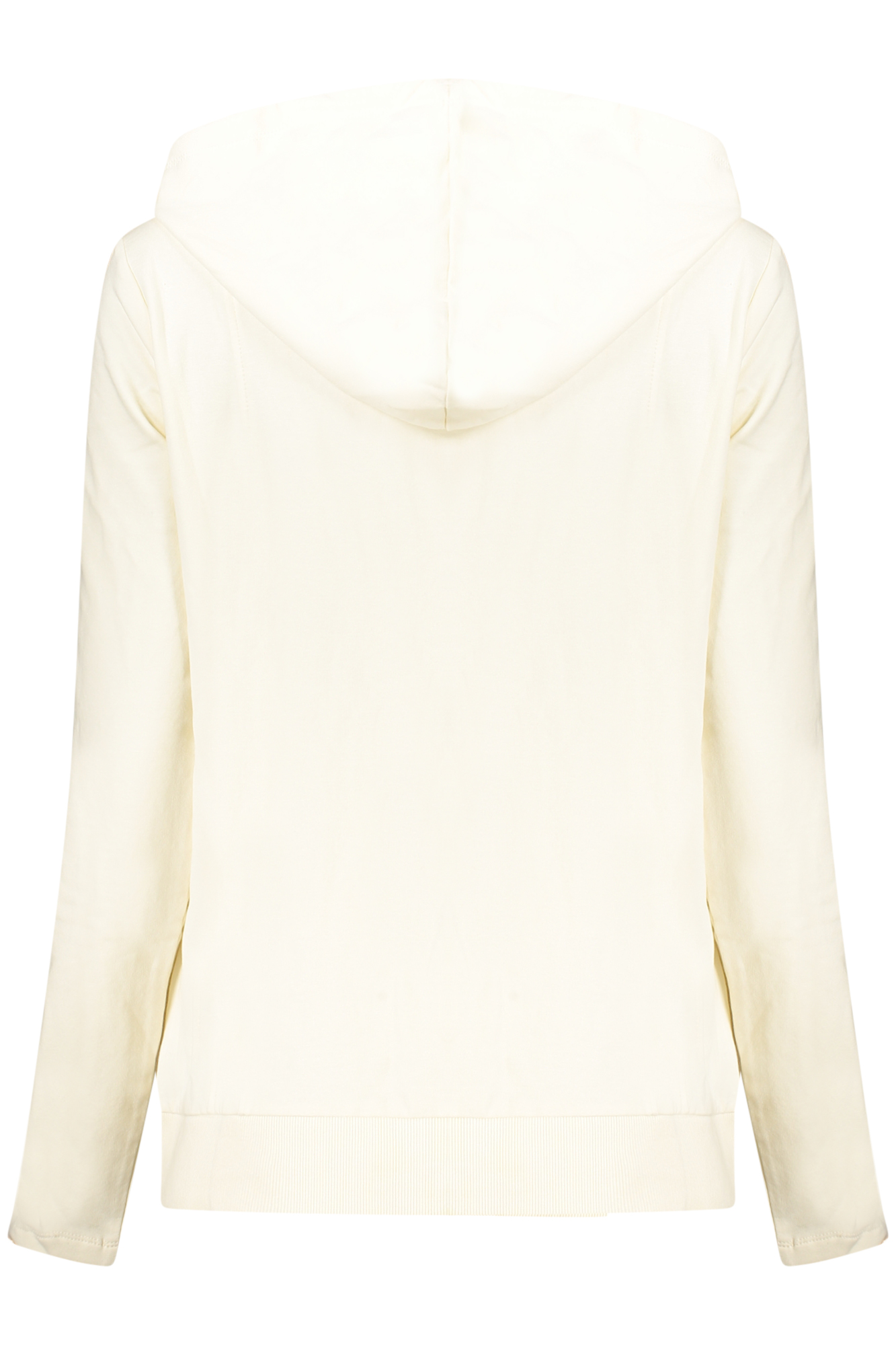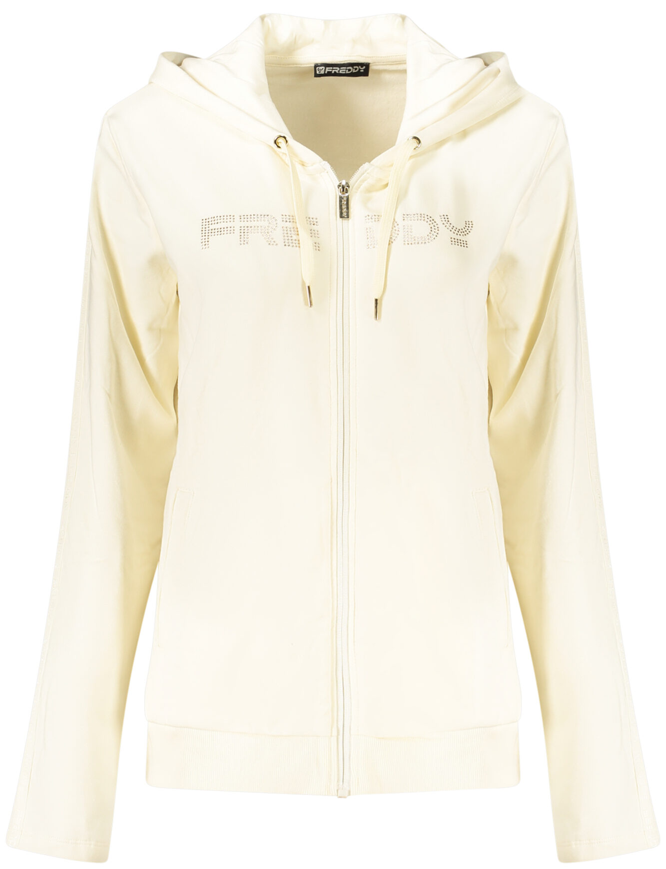Casaco de manga comprida com capuz, estilo camisola, com 2 bolsos frontais, fecho de correr, aplicação de strass decorativa e logótipo da marca.