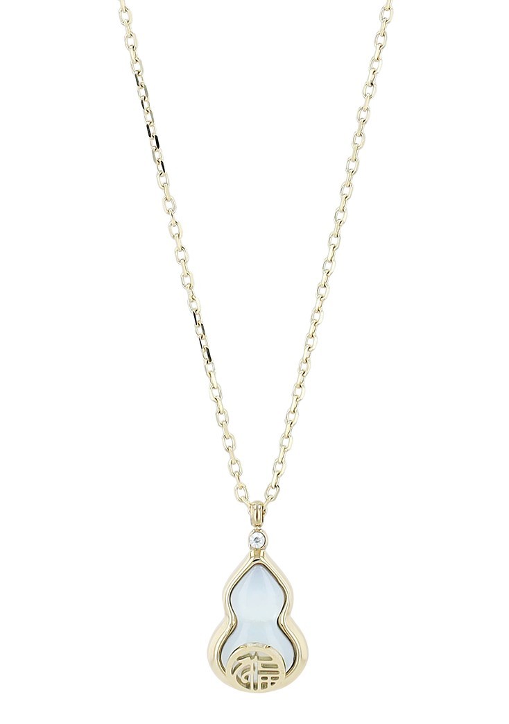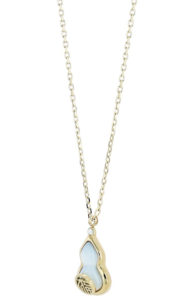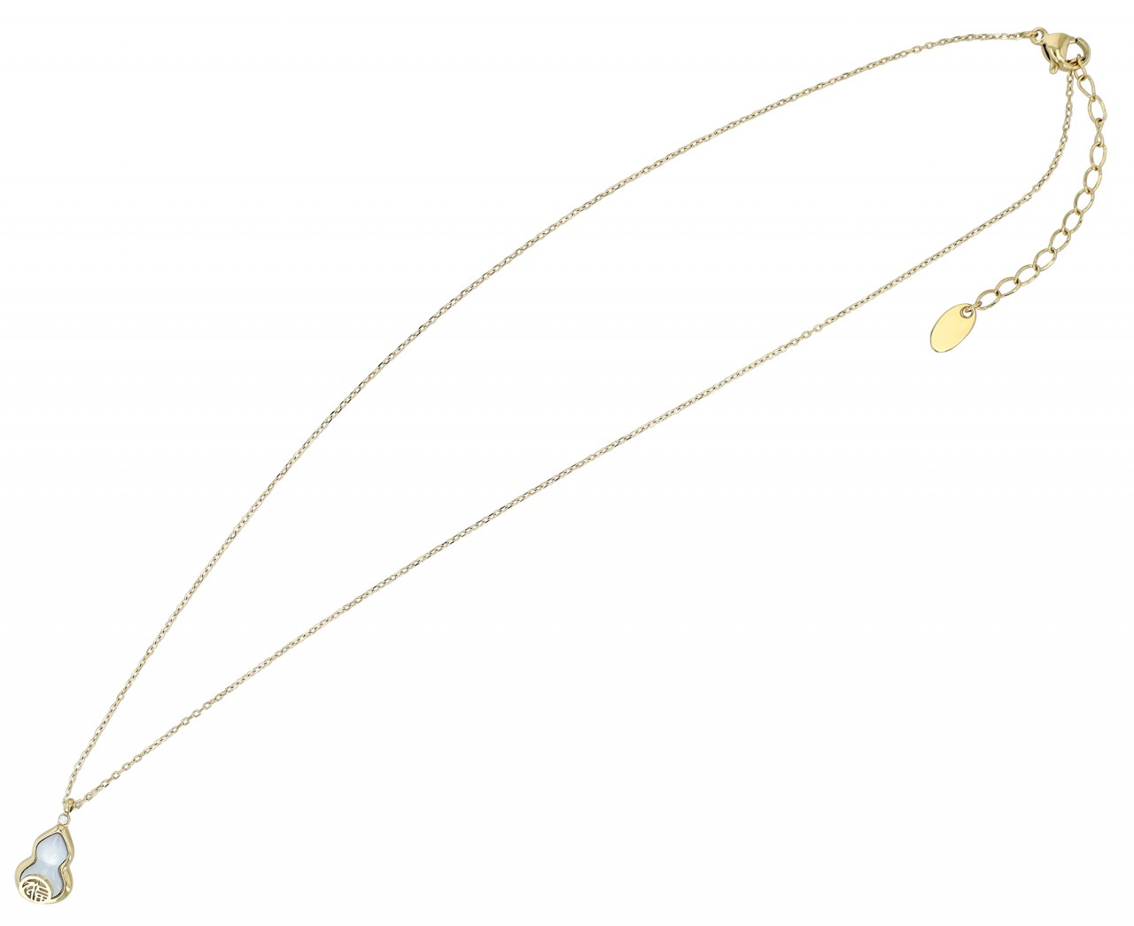 Este elegante colar de aço inoxidável dourado combina design estiloso com profundo simbolismo. O pingente artisticamente desenhado em forma de cabaça – um símbolo tradicional de longevidade, felicidade e prosperidade – dá a esta joia um significado especial. O pingente de 17,5 mm de comprimento e 9 mm de largura é coberto com madrepérola brilhante e decorado com zircônia brilhante. Um pequeno símbolo chinês aplicado destaca a mensagem espiritual do design. Com um comprimento total de 41,5 cm e uma extensão adicional de 5 cm, a corrente oferece uma opção de uso flexível. O prático fecho tipo mosquetão garante uma fixação segura e um uso confortável. Um acessório perfeito para quem valoriza elegância e energia positiva.