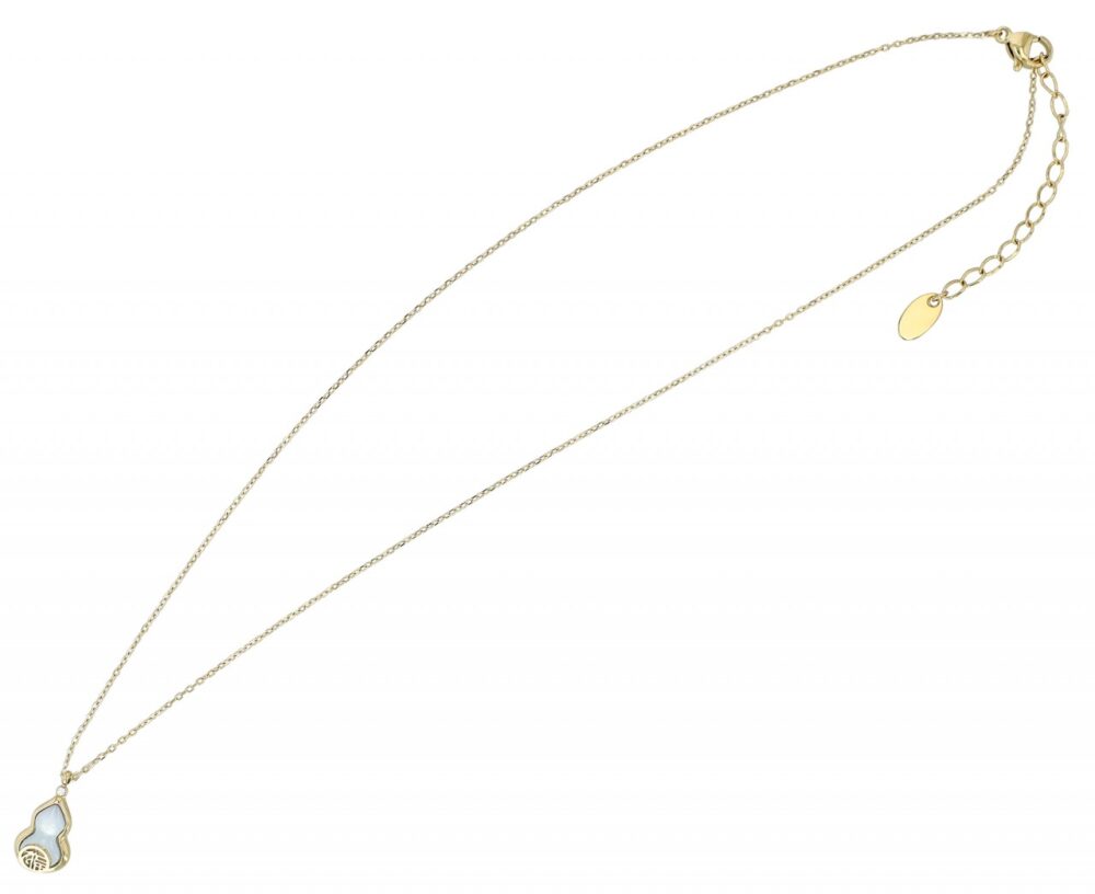 Este elegante colar de aço inoxidável dourado combina design estiloso com profundo simbolismo. O pingente artisticamente desenhado em forma de cabaça – um símbolo tradicional de longevidade, felicidade e prosperidade – dá a esta joia um significado especial. O pingente de 17,5 mm de comprimento e 9 mm de largura é coberto com madrepérola brilhante e decorado com zircônia brilhante. Um pequeno símbolo chinês aplicado destaca a mensagem espiritual do design. Com um comprimento total de 41,5 cm e uma extensão adicional de 5 cm, a corrente oferece uma opção de uso flexível. O prático fecho tipo mosquetão garante uma fixação segura e um uso confortável. Um acessório perfeito para quem valoriza elegância e energia positiva.