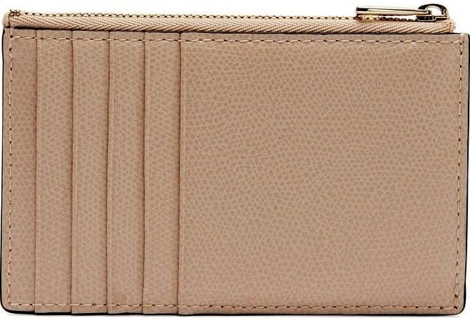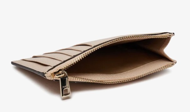 Conta com fecho de correr seguro e espaços exteriores para cartões, permitindo acesso rápido aos essenciais.