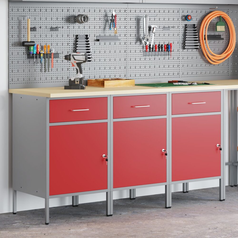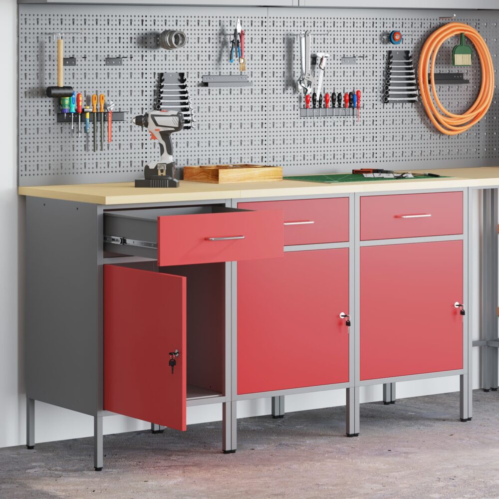 O Armrio de Trabalho Industrial com Gaveta e Porta uma escolha prtica para armazenamento em oficinas, garagens ou escritrios desorganizados. A estrutura de ao resistente, e a parte superior de madeira estilosa. Tem uma gaveta suave para fcil acesso s ferramentas e um armrio com chave para manter objetos de valor seguros. Ps ajustveis permitem adaptao a qualquer piso. Com dimenses de 150 x 55 x 85 cm, perfeito para espaos pequenos e oferece bastante armazenamento. Ideal para profissionais e entusiastas de DIY!