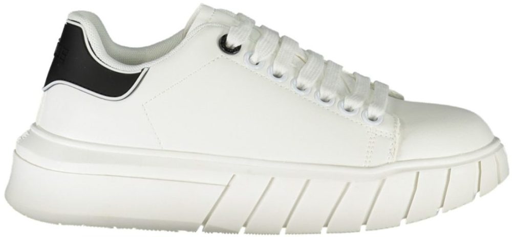 Calçado desportivo com atacadores, detalhes contrastantes, logótipo.