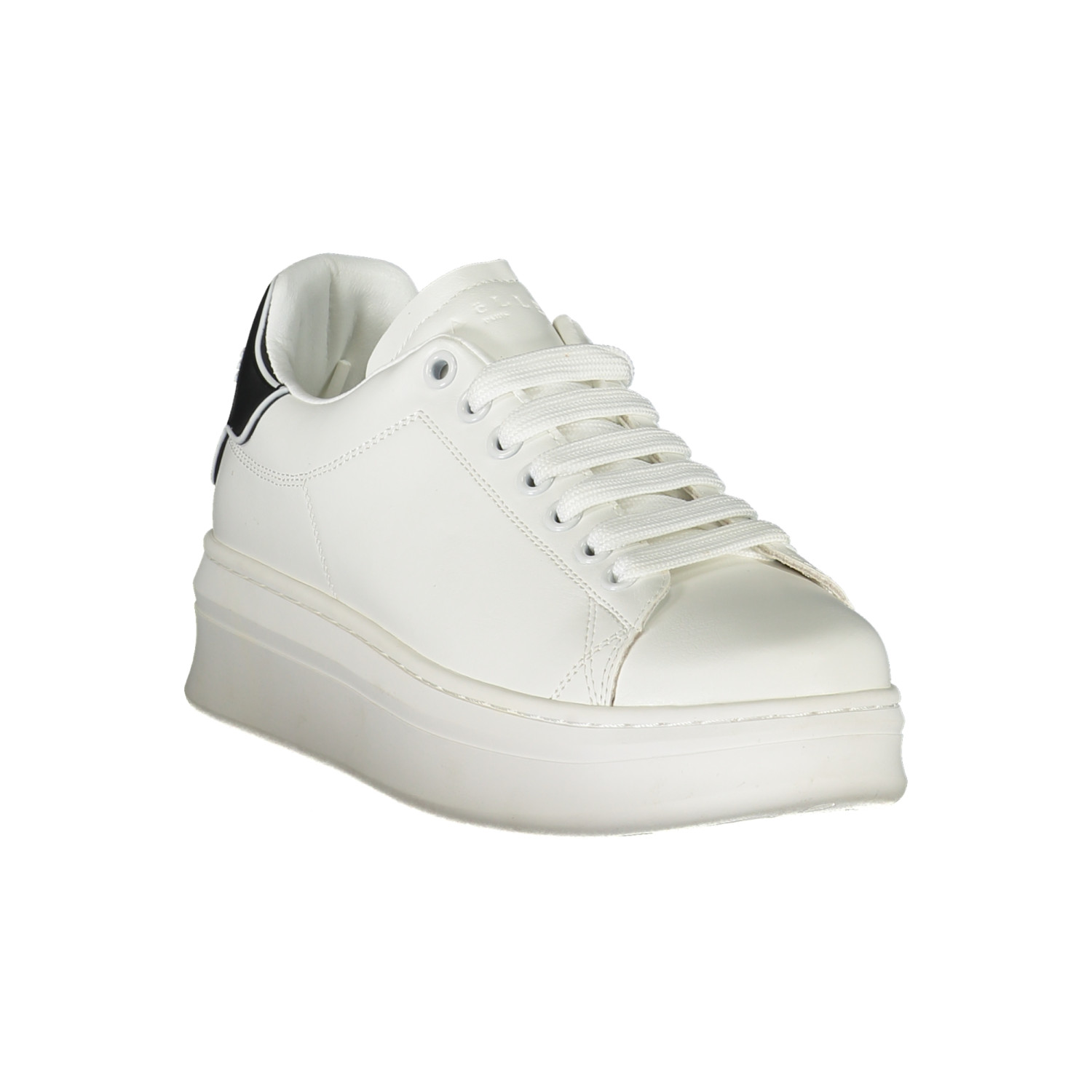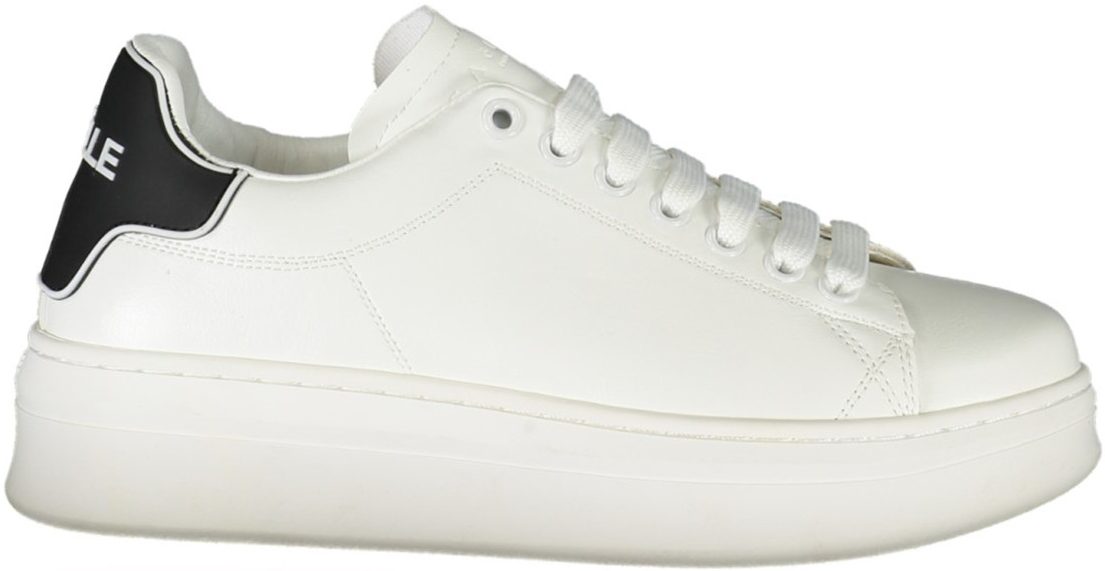 Calçado desportivo com atacadores, detalhes contrastantes, logótipo.