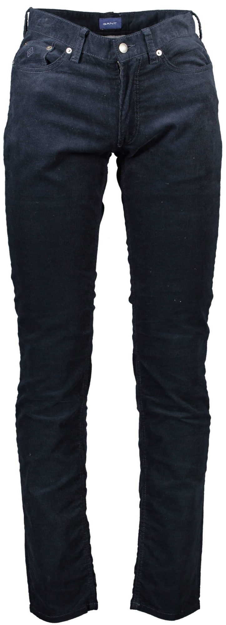 Calça de 5 bolsos, zíper e botão, logotipo.