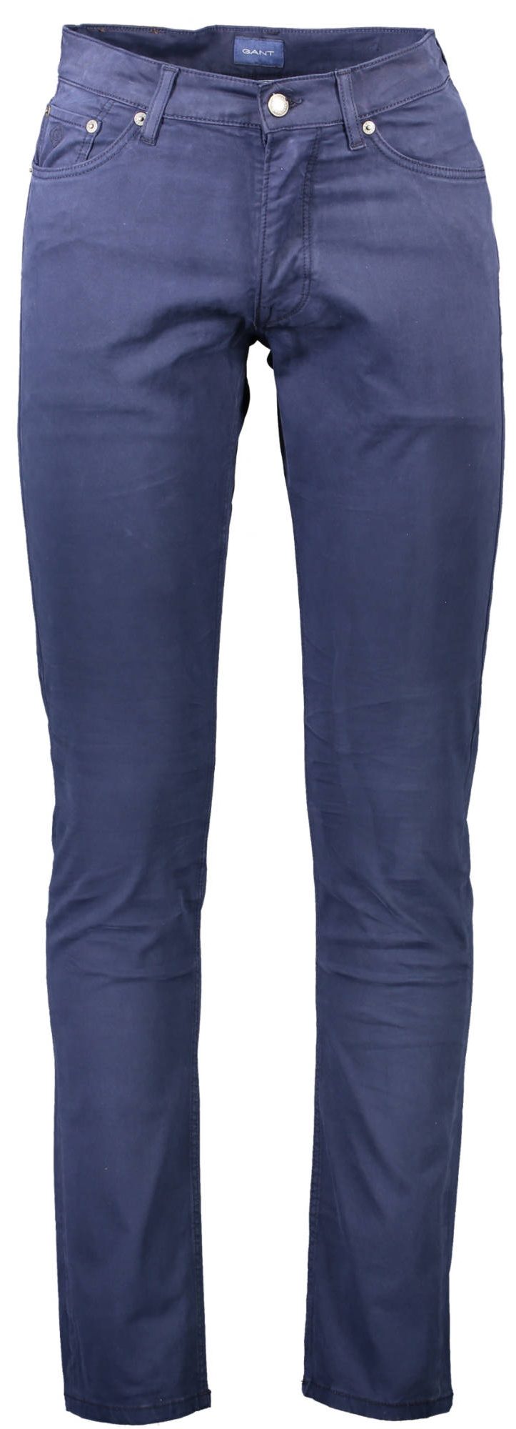 Calça slim de 5 bolsos, botão, zíper, logotipo.
