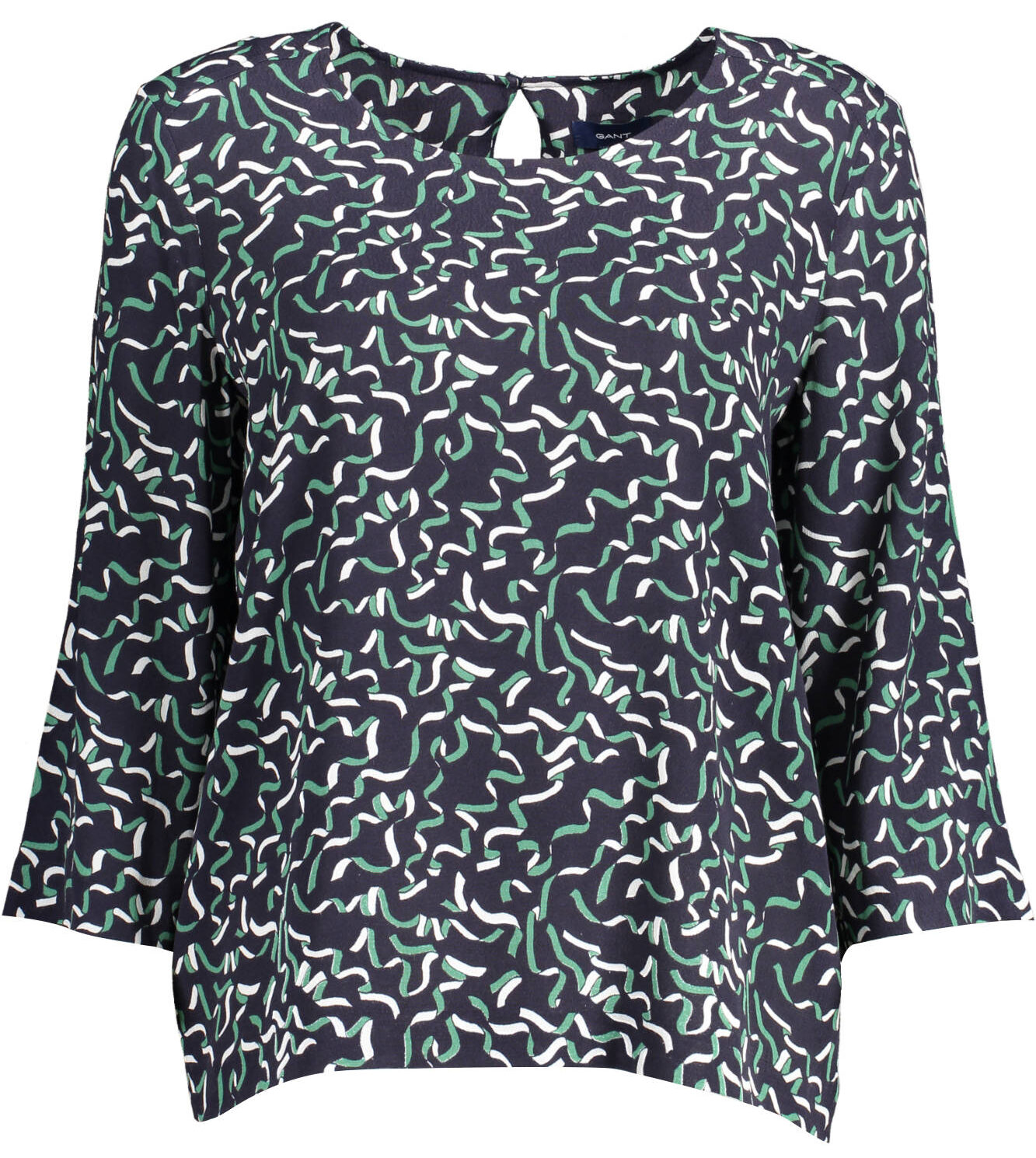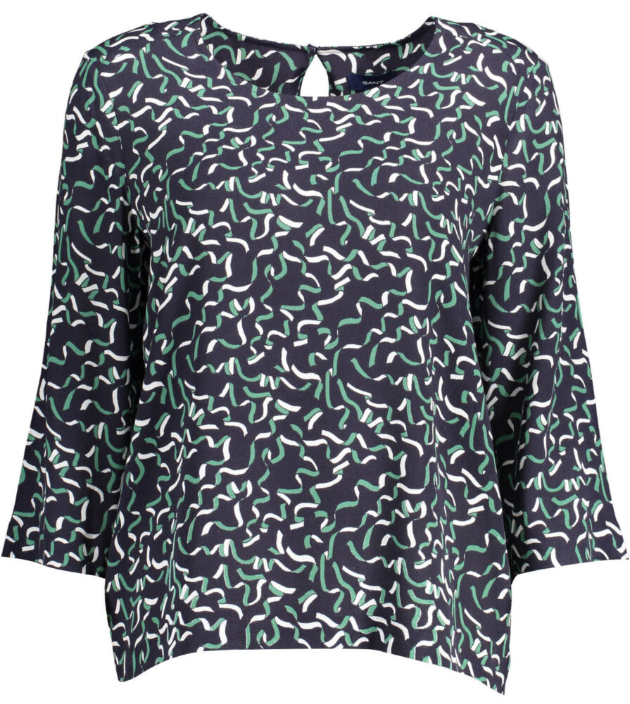 Camisa manga 3/4, decote largo, botão no pescoço, logo