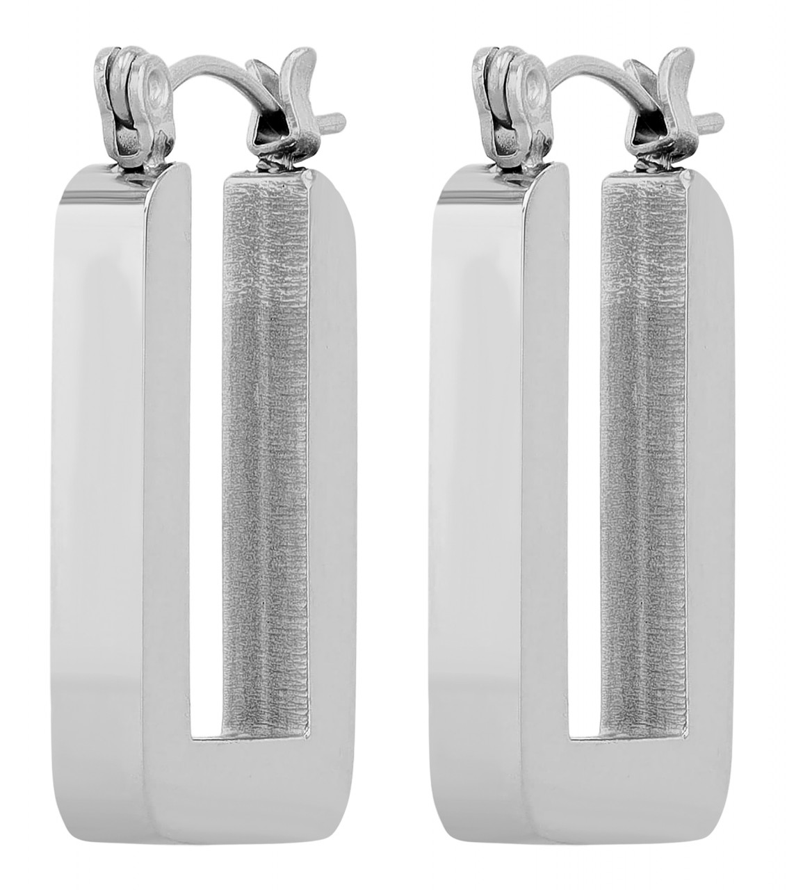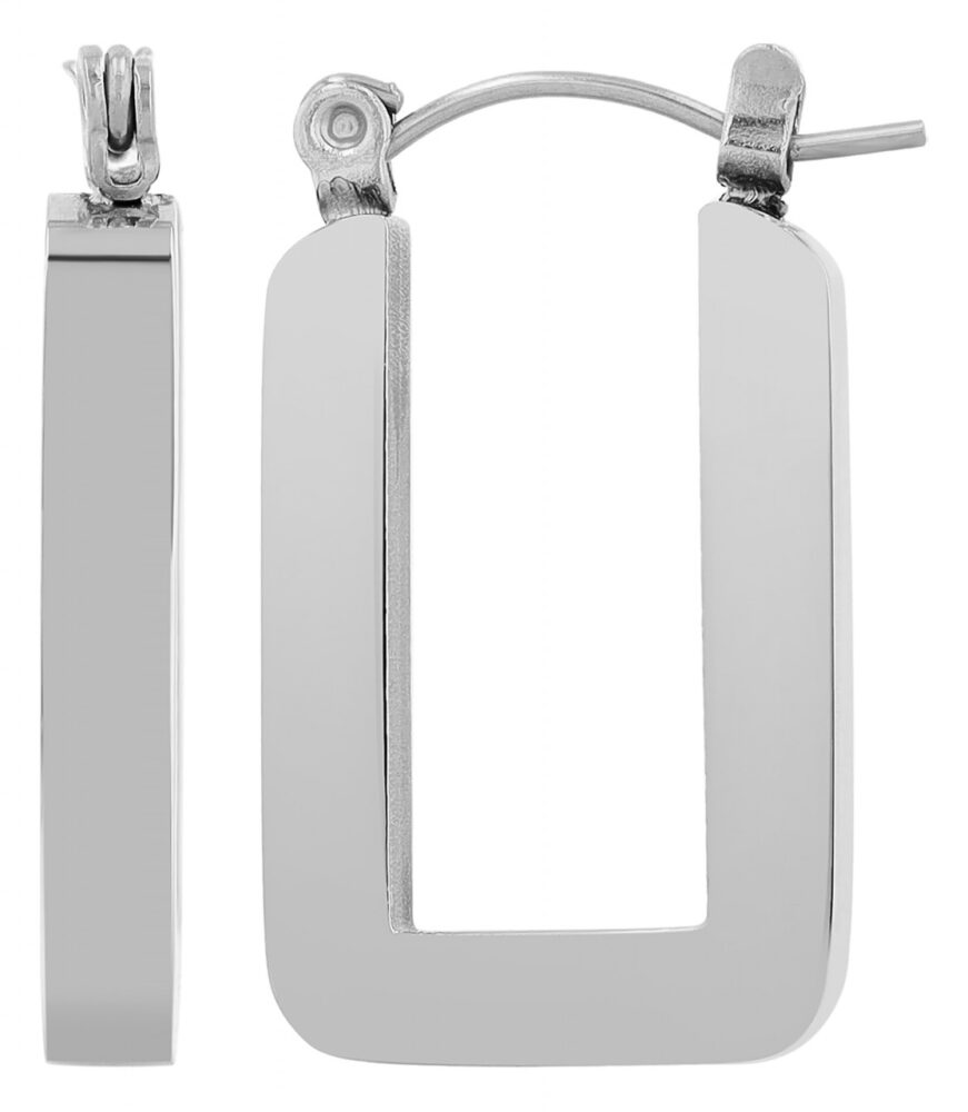 Os brincos de argola retangulares são feitos de aço inoxidável e têm um visual simples e brilhante. O fecho é feito de aço inoxidável e é prático, permitindo fácil colocação e retirada, além de garantir uma fixação segura no orifício da orelha. Os brincos de argola têm 21 mm de altura, 3 mm de largura e 3 mm de espessura.
