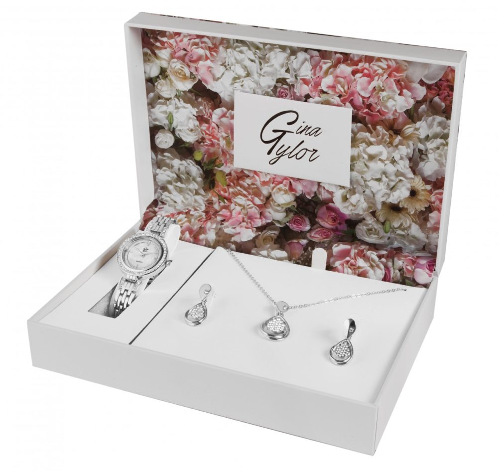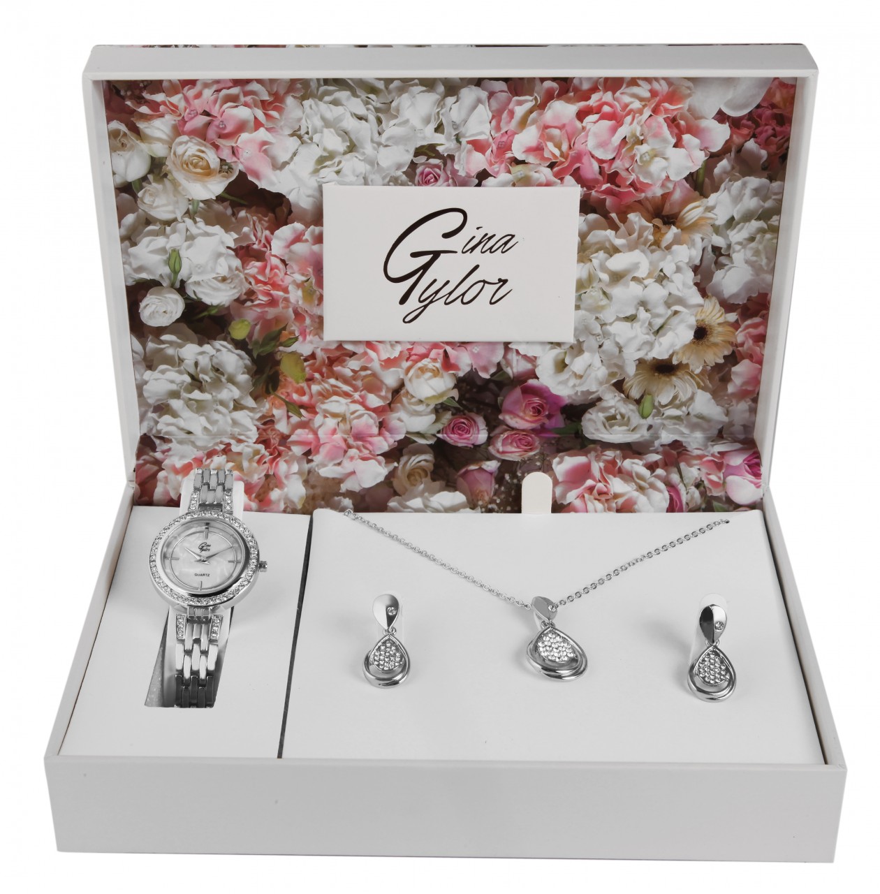 O conjunto presente da marca Gina Tylor é composto por um relógio de pulso com luneta cravejada com 48 pedras simili. O conjunto também inclui um colar e um par de brincos. As peças de joalheria têm cores coordenadas e podem ser combinadas perfeitamente. O conjunto presente da marca Gina Tylor é composto por um relógio de pulso com luneta cravejada com 48 pedras simili. O conjunto também inclui um colar e um par de brincos. As peças de joalheria têm cores coordenadas e podem ser combinadas perfeitamente.