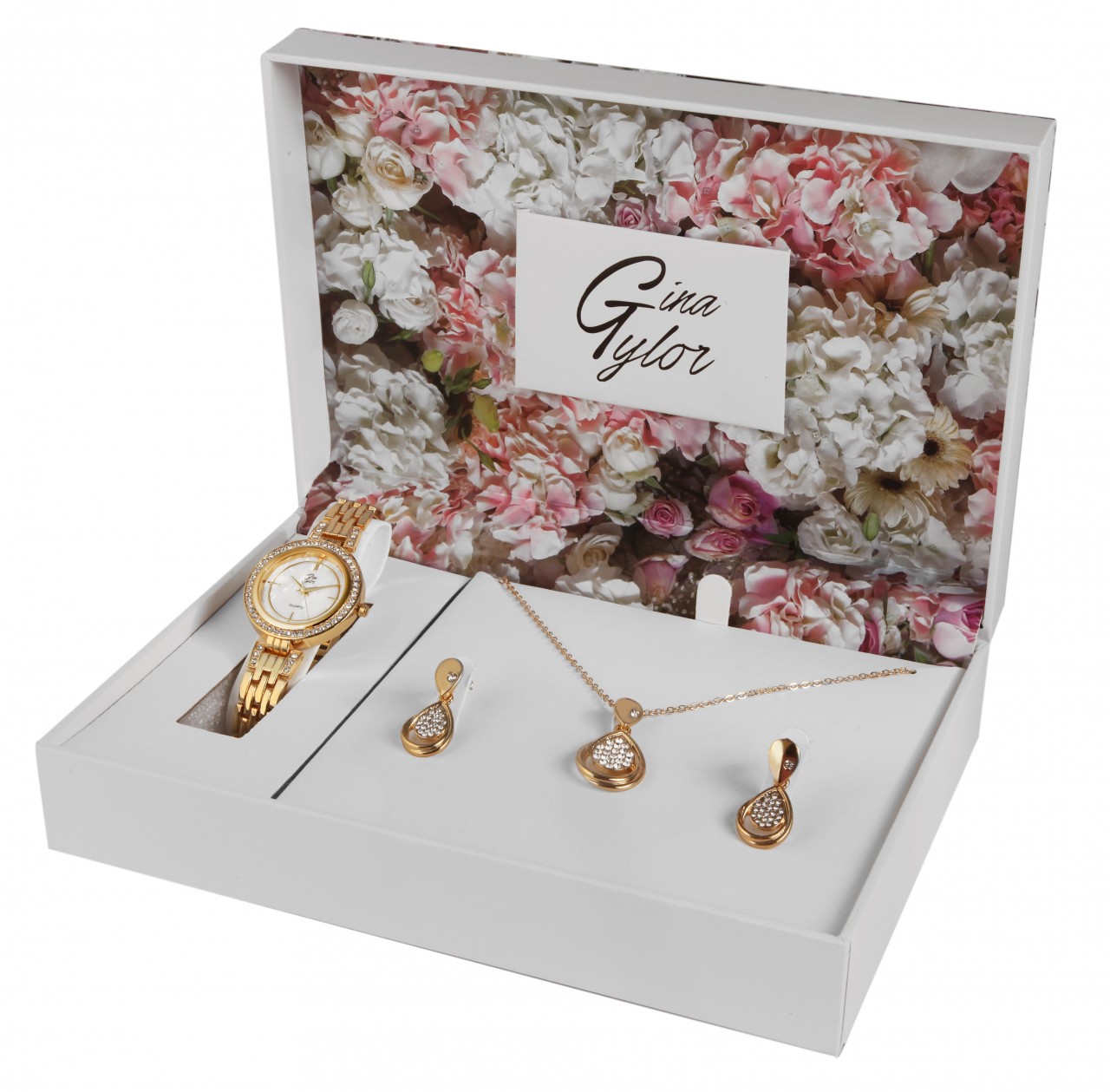 O conjunto presente da marca Gina Tylor é composto por um relógio de pulso com luneta cravejada com 48 pedras simili. O conjunto também inclui um colar e um par de brincos. As peças de joalheria têm cores coordenadas e podem ser combinadas perfeitamente. O conjunto presente da marca Gina Tylor é composto por um relógio de pulso com luneta cravejada com 48 pedras simili. O conjunto também inclui um colar e um par de brincos. As peças de joalheria têm cores coordenadas e podem ser combinadas perfeitamente.