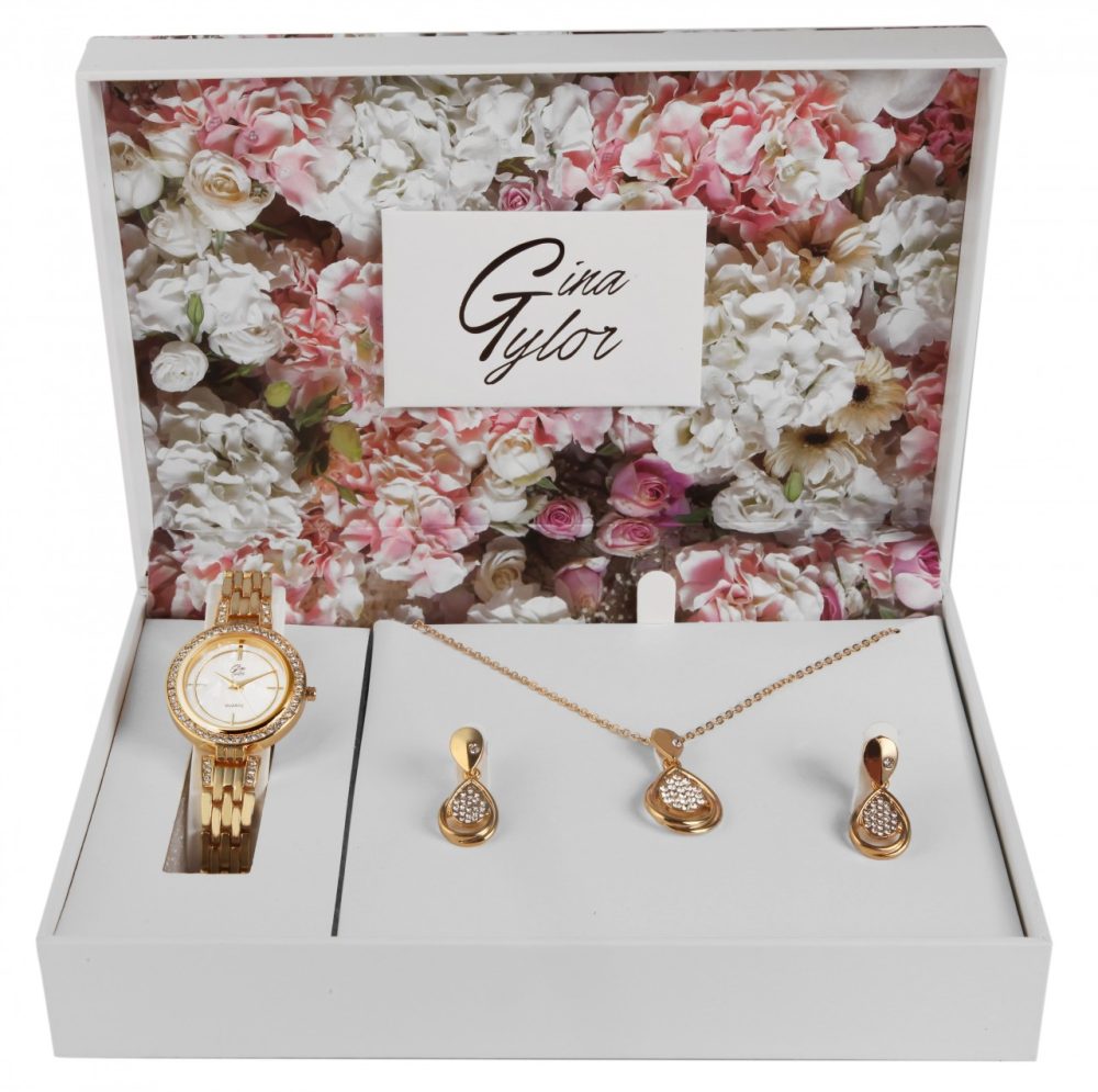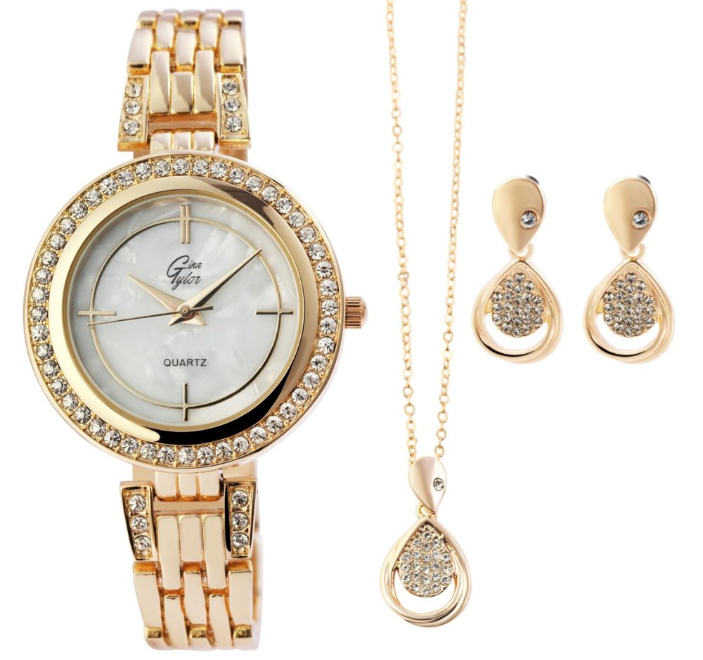 O conjunto presente da marca Gina Tylor é composto por um relógio de pulso com luneta cravejada com 48 pedras simili. O conjunto também inclui um colar e um par de brincos. As peças de joalheria têm cores coordenadas e podem ser combinadas perfeitamente. O conjunto presente da marca Gina Tylor é composto por um relógio de pulso com luneta cravejada com 48 pedras simili. O conjunto também inclui um colar e um par de brincos. As peças de joalheria têm cores coordenadas e podem ser combinadas perfeitamente.