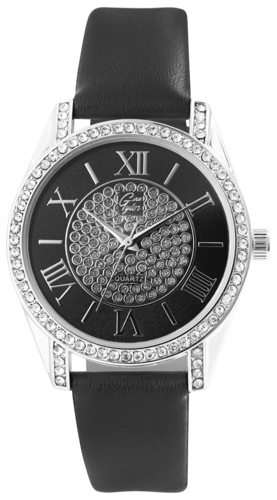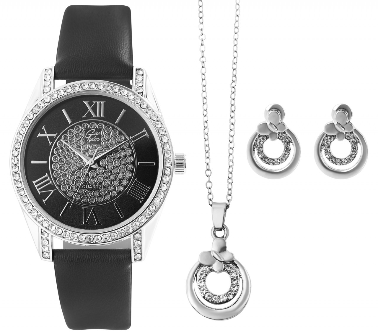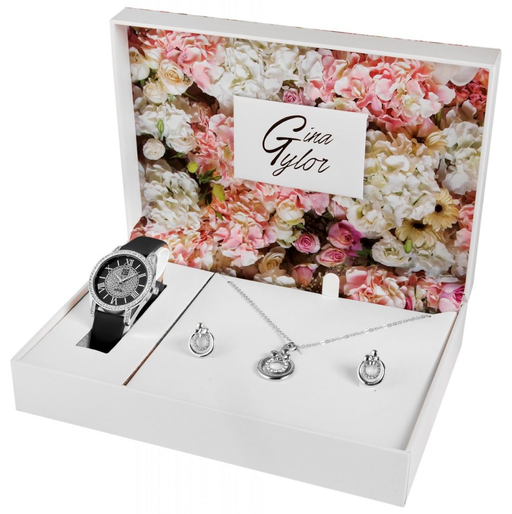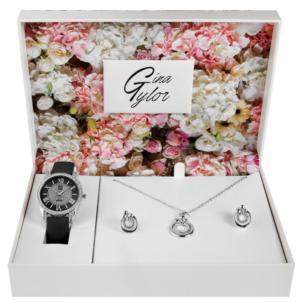 O conjunto presente da marca Gina Tylor é composto por um relógio de pulso com luneta cravejada com 60 pedras simili.