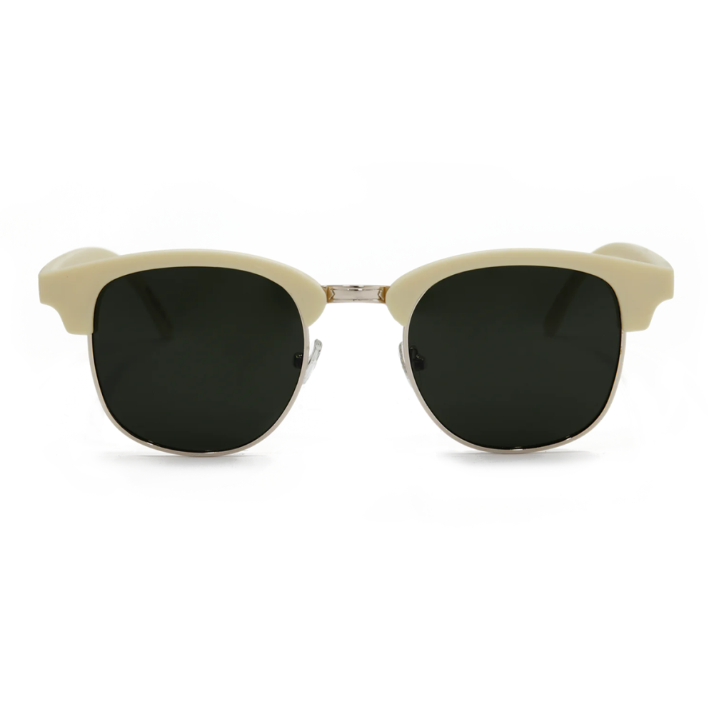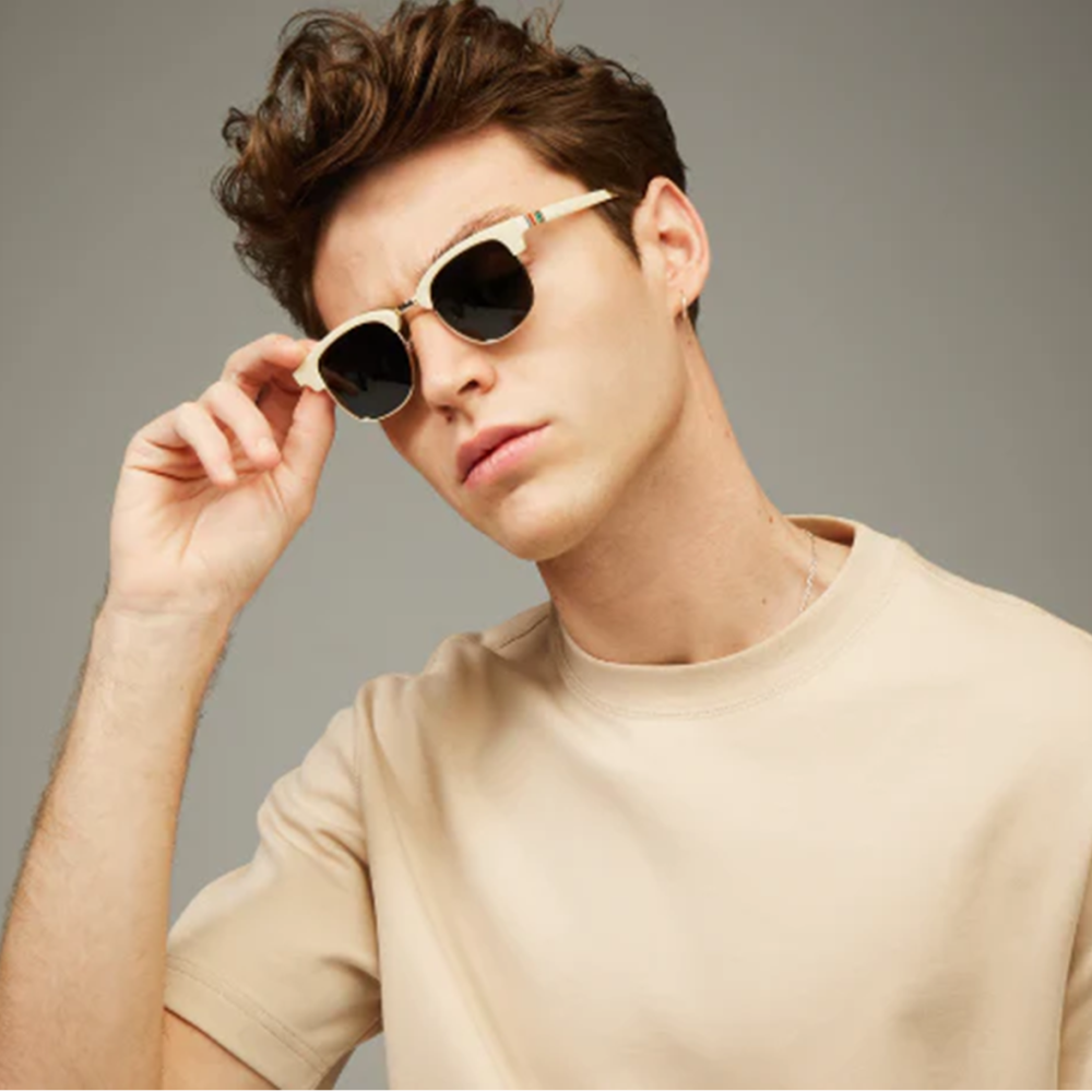 O modelo “PVG” pertence à coleção Crew, uma linha de óculos de sol cujas armações deixam parte da lente exposta, dando-lhes um toque mais sofisticado graças ao aro dourado que as envolve.