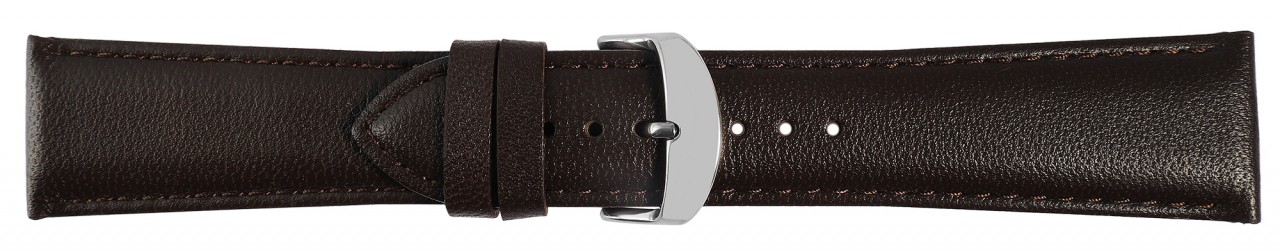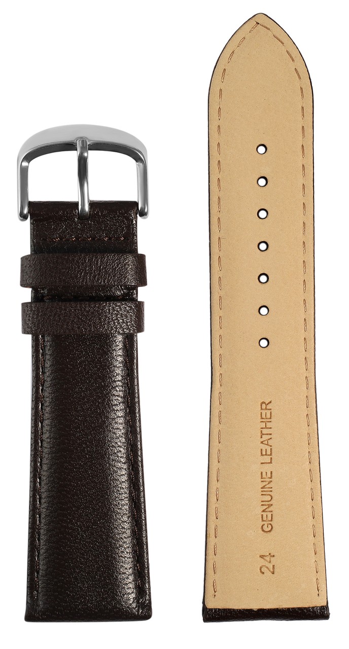 Esta pulseira de relógio marrom escuro feita de couro genuíno de alta qualidade está disponível em larguras de 12 mm, 14 mm, 16 mm, 18 mm, 20 mm, 22 mm e 24 mm, oferecendo uma opção adequada para diferentes modelos de relógio. A pulseira acolchoada é acentuada por uma costura fina marrom escura e dá ao relógio um visual particularmente elegante. O pino do fecho é 2 mm mais estreito que a largura do pino porque a tira afunila em um ponto estreito. O comprimento total da pulseira varia dependendo da largura do pino e fica entre 18 cm e 19,5 cm. A pulseira de substituição pode ser facilmente aberta e fechada com uma fivela prateada. O primeiro laço é costurado firmemente enquanto o segundo é ajustável individualmente.