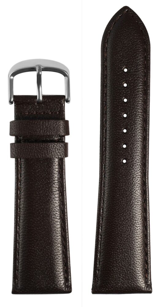 Esta pulseira de relógio marrom escuro feita de couro genuíno de alta qualidade está disponível em larguras de 12 mm, 14 mm, 16 mm, 18 mm, 20 mm, 22 mm e 24 mm, oferecendo uma opção adequada para diferentes modelos de relógio. A pulseira acolchoada é acentuada por uma costura fina marrom escura e dá ao relógio um visual particularmente elegante. O pino do fecho é 2 mm mais estreito que a largura do pino porque a tira afunila em um ponto estreito. O comprimento total da pulseira varia dependendo da largura do pino e fica entre 18 cm e 19,5 cm. A pulseira de substituição pode ser facilmente aberta e fechada com uma fivela prateada. O primeiro laço é costurado firmemente enquanto o segundo é ajustável individualmente.