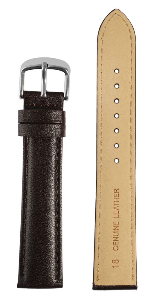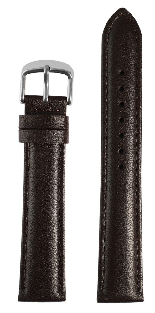Esta pulseira de relógio marrom escuro feita de couro genuíno de alta qualidade está disponível em larguras de 12 mm, 14 mm, 16 mm, 18 mm, 20 mm, 22 mm e 24 mm, oferecendo uma opção adequada para diferentes modelos de relógio. A pulseira acolchoada é acentuada por uma costura fina marrom escura e dá ao relógio um visual particularmente elegante. O pino do fecho é 2 mm mais estreito que a largura do pino porque a tira afunila em um ponto estreito. O comprimento total da pulseira varia dependendo da largura do pino e fica entre 18 cm e 19,5 cm. A pulseira de substituição pode ser facilmente aberta e fechada com uma fivela prateada. O primeiro laço é costurado firmemente enquanto o segundo é ajustável individualmente.