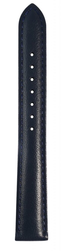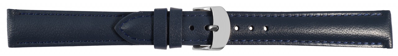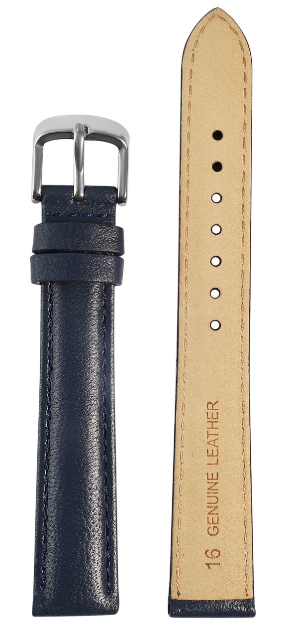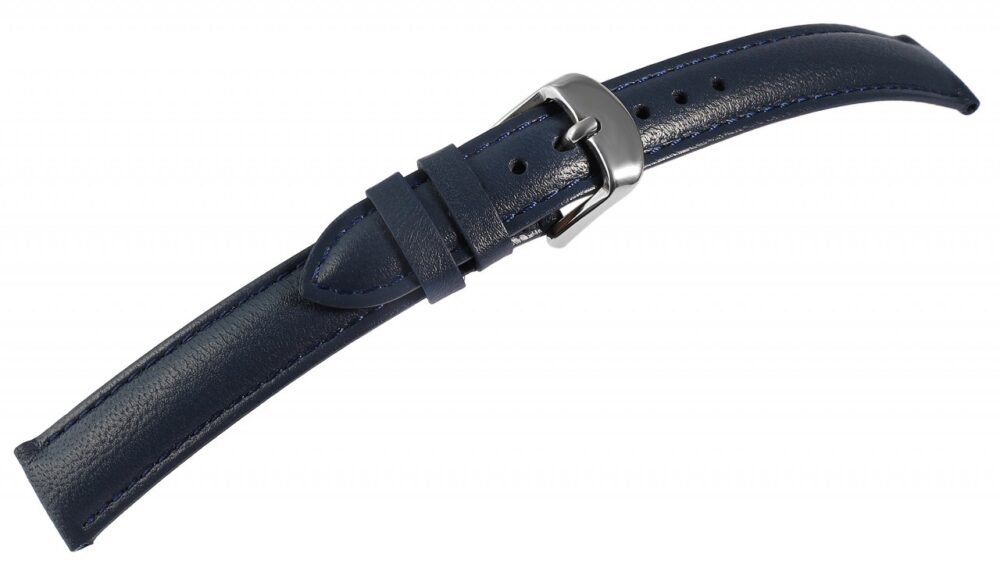 Feita de couro genuíno de alta qualidade na cor azul escuro, esta pulseira de relógio está disponível em larguras de 12 mm, 14 mm, 16 mm, 18 mm, 20 mm, 22 mm e 24 mm, oferecendo uma opção adequada para diferentes modelos de relógio. A pulseira é acentuada por uma fina costura azul escura e acolchoada, dando ao relógio um visual particularmente elegante. O pino do fecho é 2 mm mais estreito que a largura do pino porque a tira afunila em um ponto estreito. O comprimento total da pulseira varia dependendo da largura do pino e fica entre 18 cm e 19,5 cm. A pulseira de substituição pode ser facilmente aberta e fechada com uma fivela prateada. O primeiro laço é costurado firmemente enquanto o segundo é ajustável individualmente.