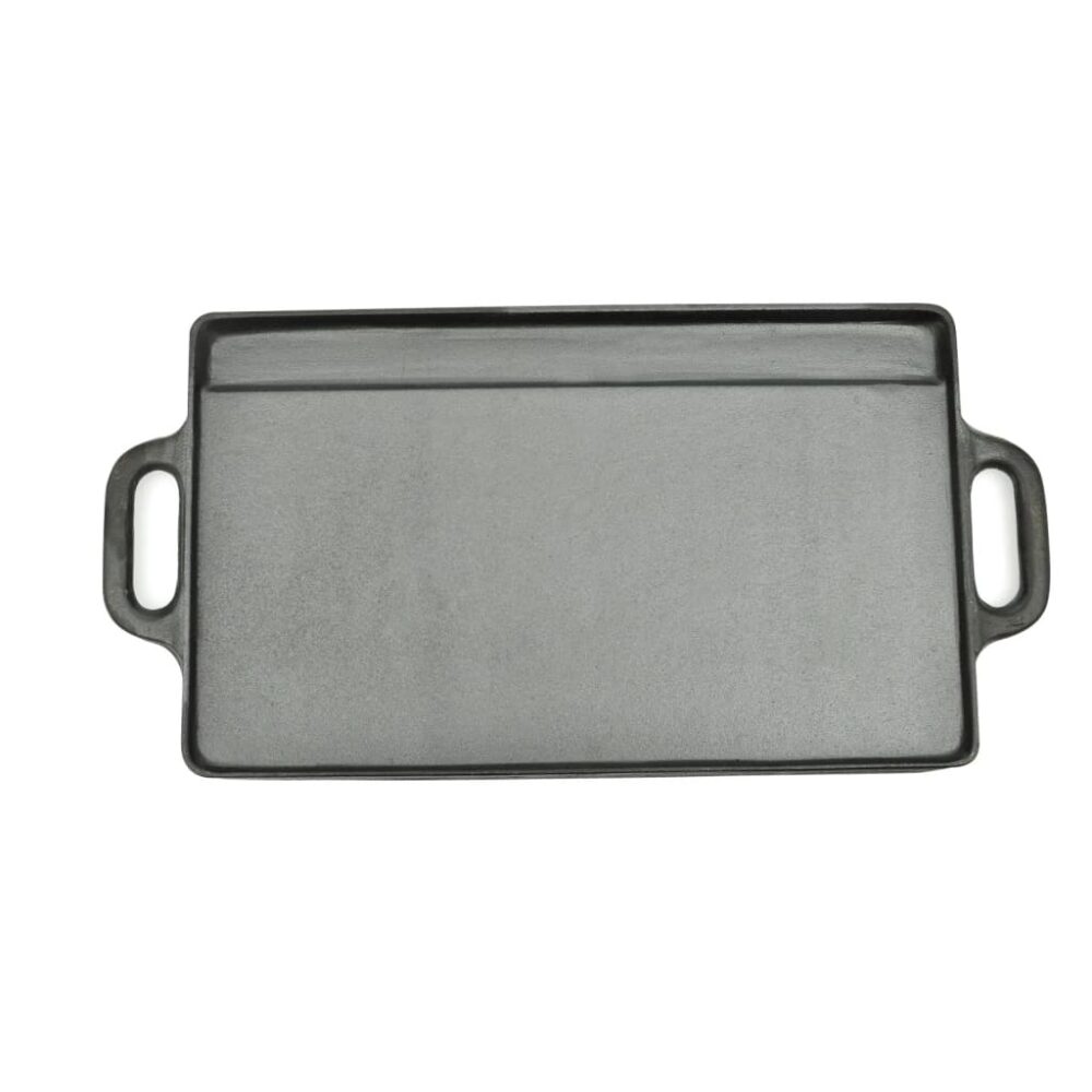 Este versátil grelhador de ferro fundido de 46 x 23 cm tem duas faces, tornando-o perfeito para muitos usos em casa ou no acampamento. O lado liso pode ser usado para assar pizza, torrar sanduiches, fritar omeletes, ovos, bacon, vegetais picados e muito mais.