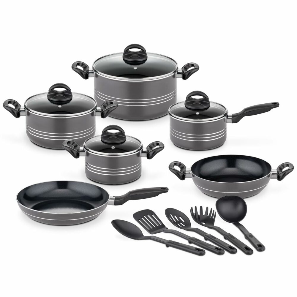 - Conjunto de panelas tudo em um: O conjunto de 15 peças inclui panelas ( 16/20/24 cm) e uma panela de 16 cm com tampas de vidro, uma frigideira de 24 cm, uma frigideira de 28 cm e cinco utensílios práticos de cozinha, como colheres e espátulas.