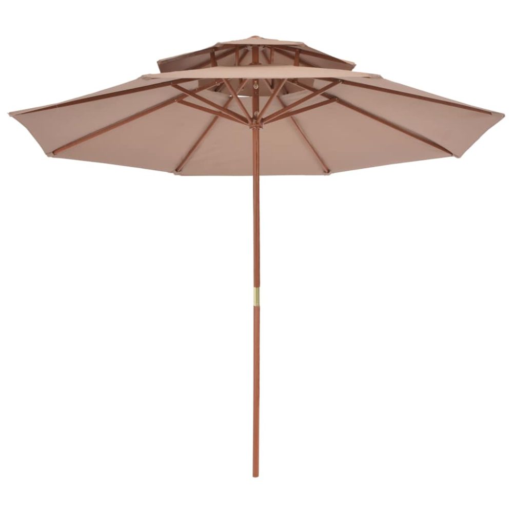 Feita de poliéster com proteção UV e à prova de desbotamento, a cobertura do guarda-sol oferece proteção ideal contra o sol e é fácil de limpar. Com um mastro com 38 mm de diâmetro, pode ser montado no suporte existente ou no meio de mesas que tenham furos. O mastro de madeira forte, juntamente com as 8 varetas duráveis, torna o guarda-sol muito estável e durável. A construção com duas coberturas permite a circulação do ar nos dias quentes. Este guarda-sol pode ser facilmente aberto e fechado graças ao sistema de roldana única. O artigo é fácil de montar.