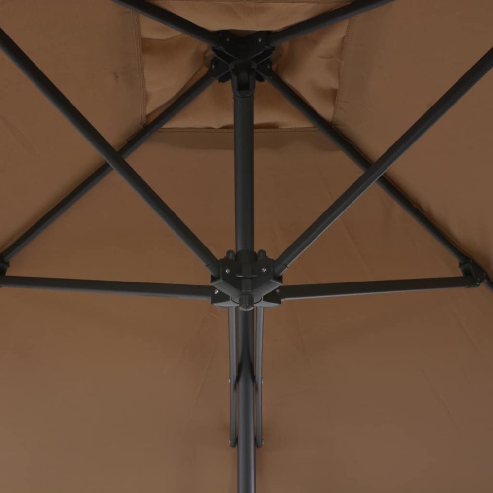 Feita em poliéster com proteção UV e à prova de desbotamento, a cobertura do guarda-sol oferece-lhe a proteção ideal contra o sol e é fácil de limpar. Possui uma base cruzada em aço robusto para adicionar estabilidade. O poste em aço forte, juntamente com as 4 varetas resistentes, tornam o guarda-sol muito estável e durável. Este guarda-sol exclusivo pode girar 360 graus para que possa ajustar facilmente o ângulo do toldo para acompanhar os movimentos do sol. O artigo é fácil de montar.