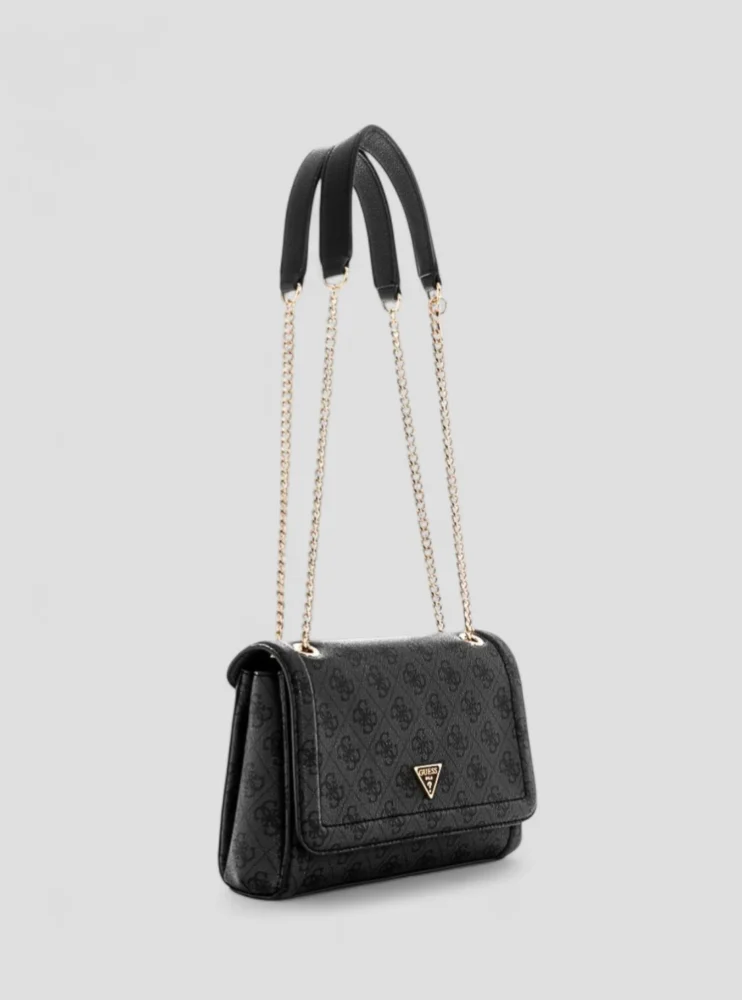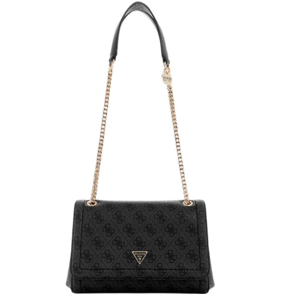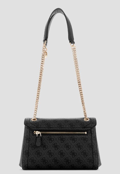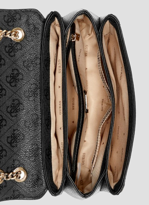 Mala , 2 alças de ombro de corrente, 1 bolso externo, 3 compartimentos separados, 1 bolso interno, espaços internos para cartões, detalhes contrastantes, fecho de botão de pressão, logotipo