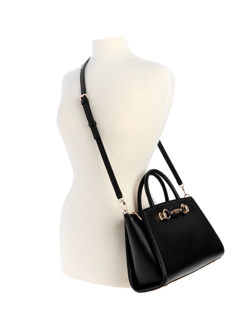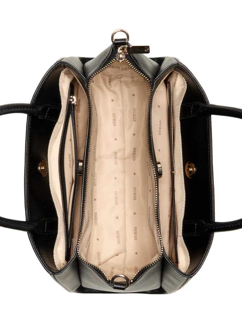 Possui dois compartimentos, bolso central com fecho, bolso interior e bolso exterior, além de espaços dedicados para documentos.