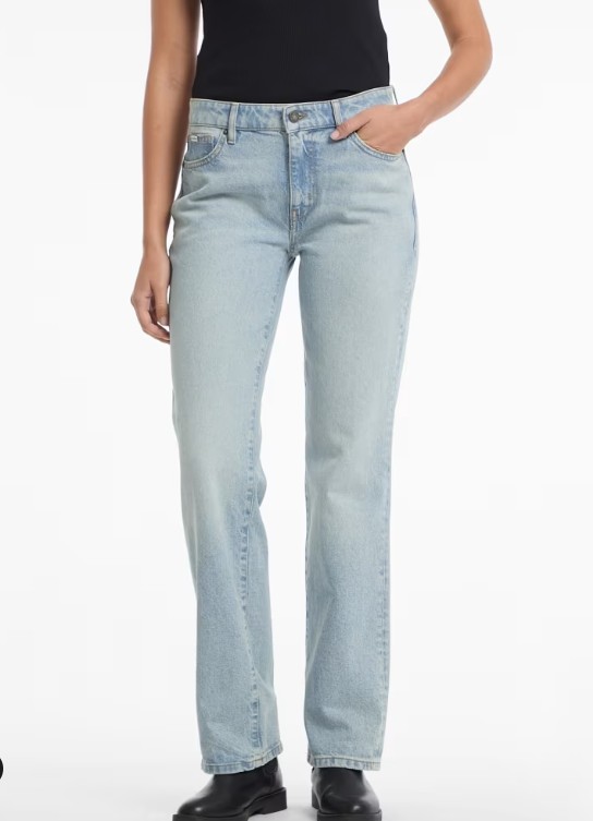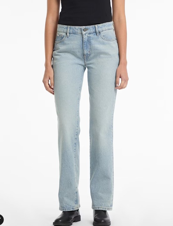 Calças de ganga direitas com cintura média, estilo clássico e confortável.