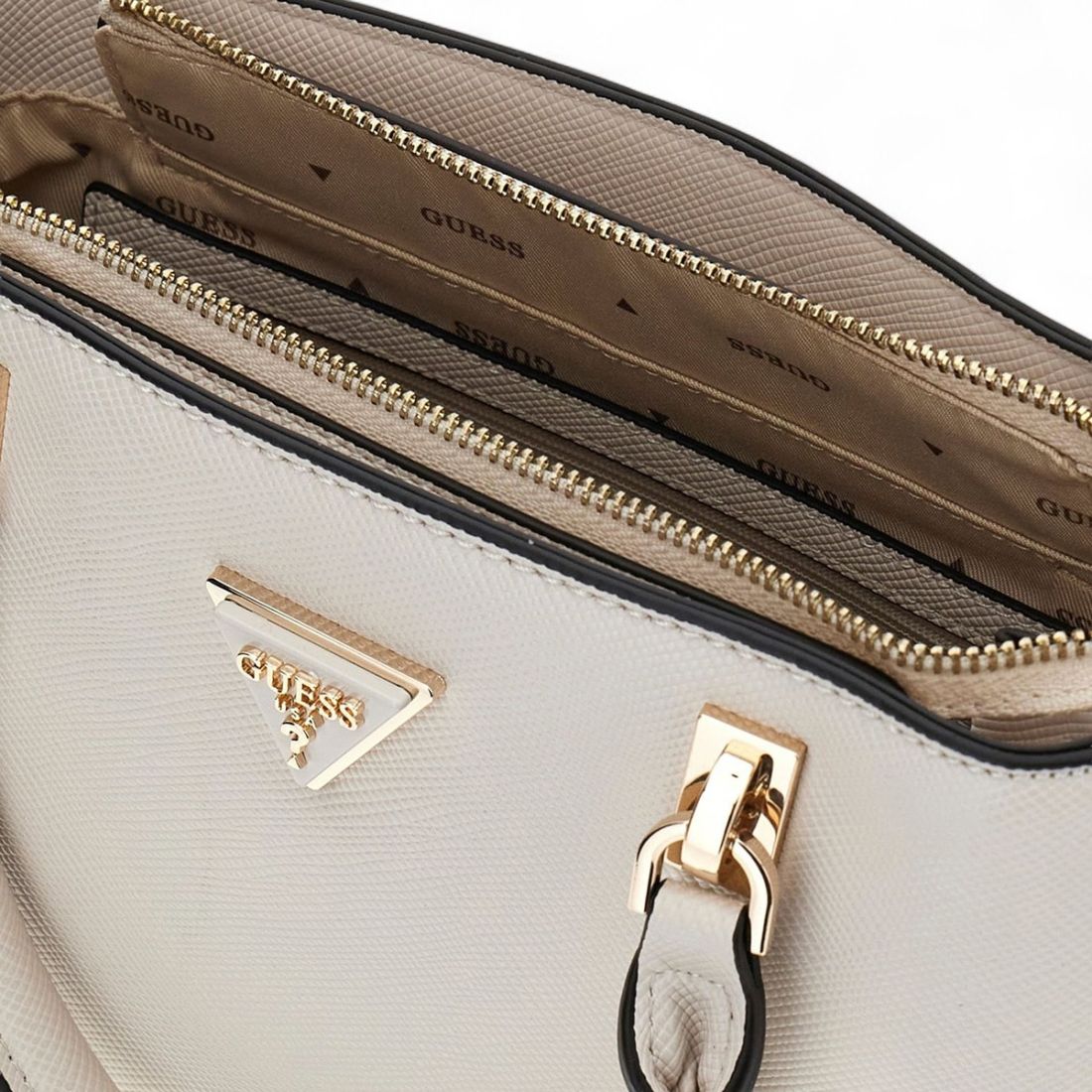 Dispõe de dois bolsos exteriores, dois compartimentos interiores, um bolso interior e espaços internos para telemóvel, permitindo uma organização eficiente dos seus essenciais.