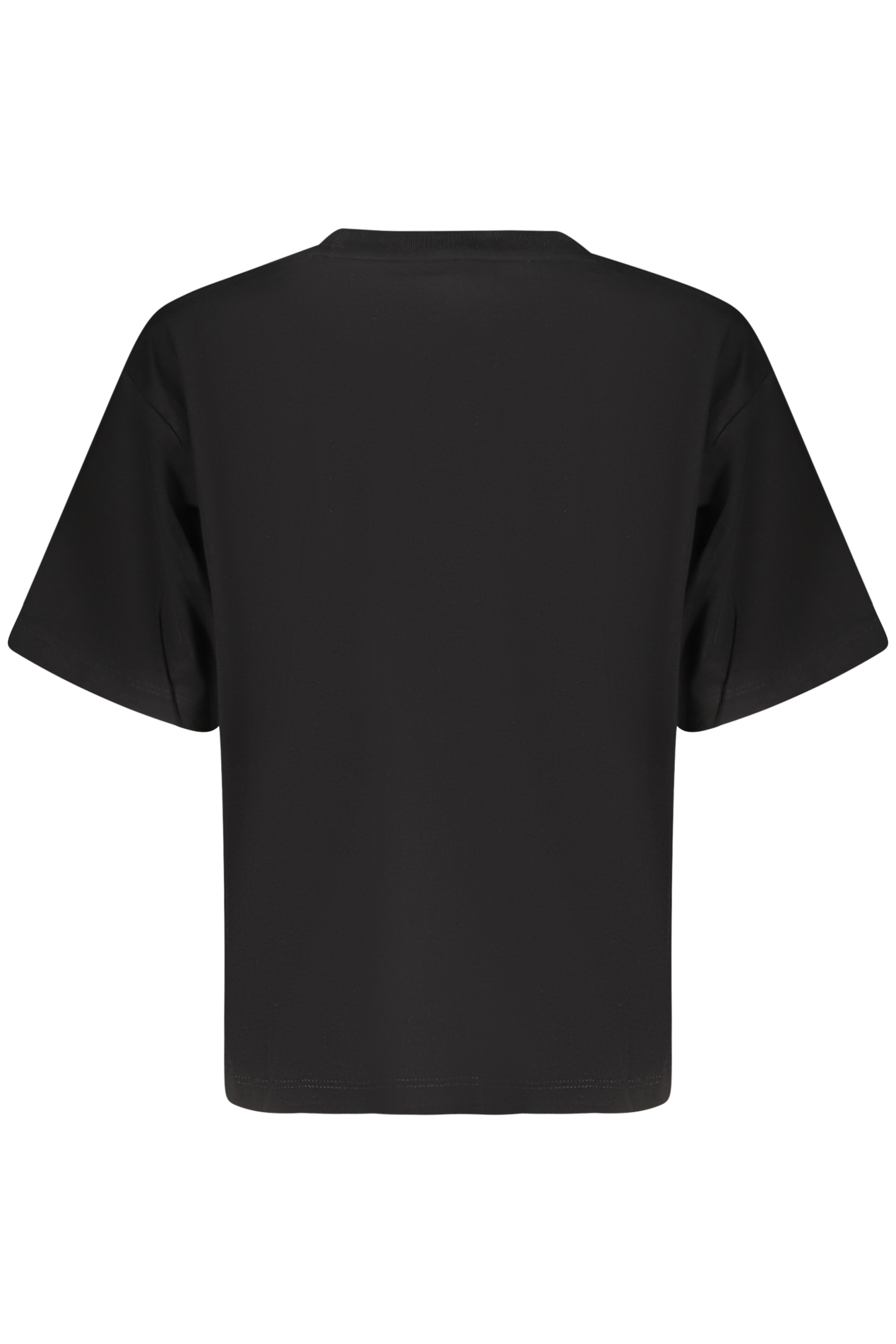 Apresenta manga curta, gola redonda e corte boxy fit, proporcionando um caimento mais largo e confortável.