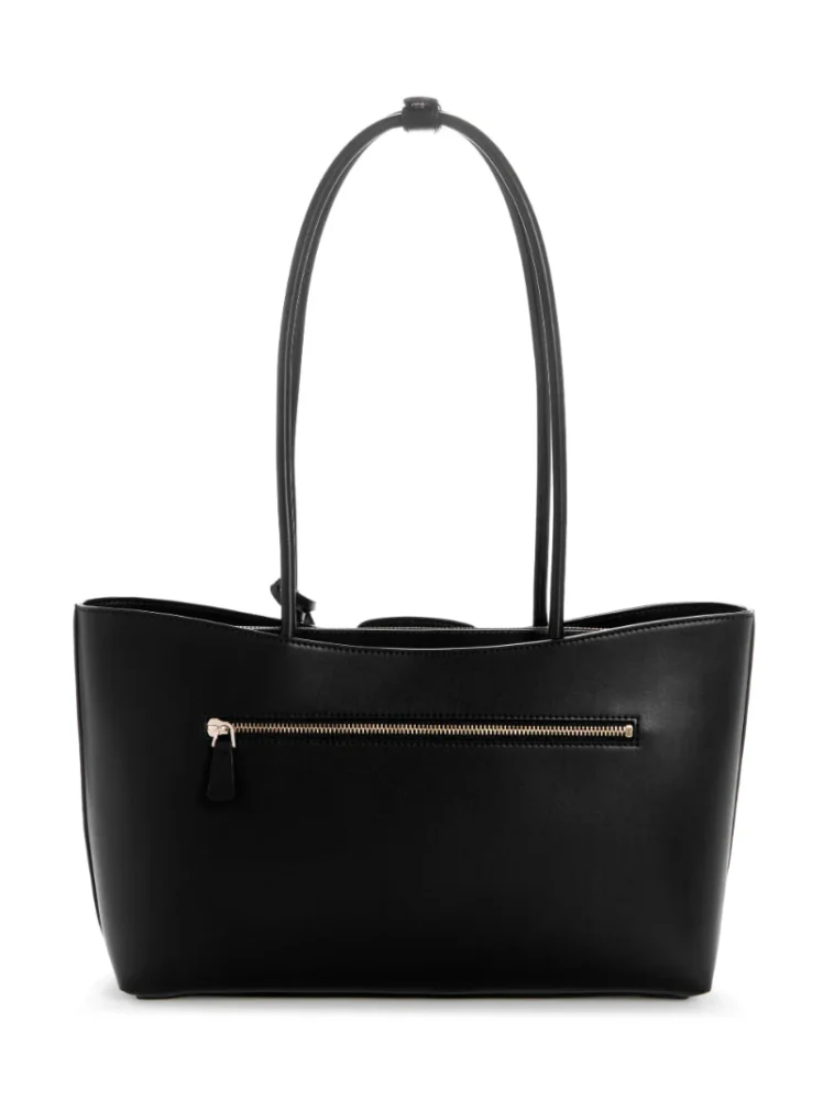Dispõe de três bolsos exteriores com fecho de correr e botão de pressão, um bolso interior e espaços internos para telemóvel, assegurando organização eficiente dos essenciais.