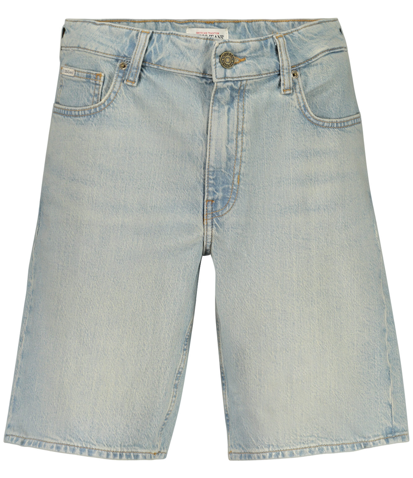 Apresenta efeito lavado, fecho com botão e zíper e logótipo, ideal para um look descontraído no dia a dia.