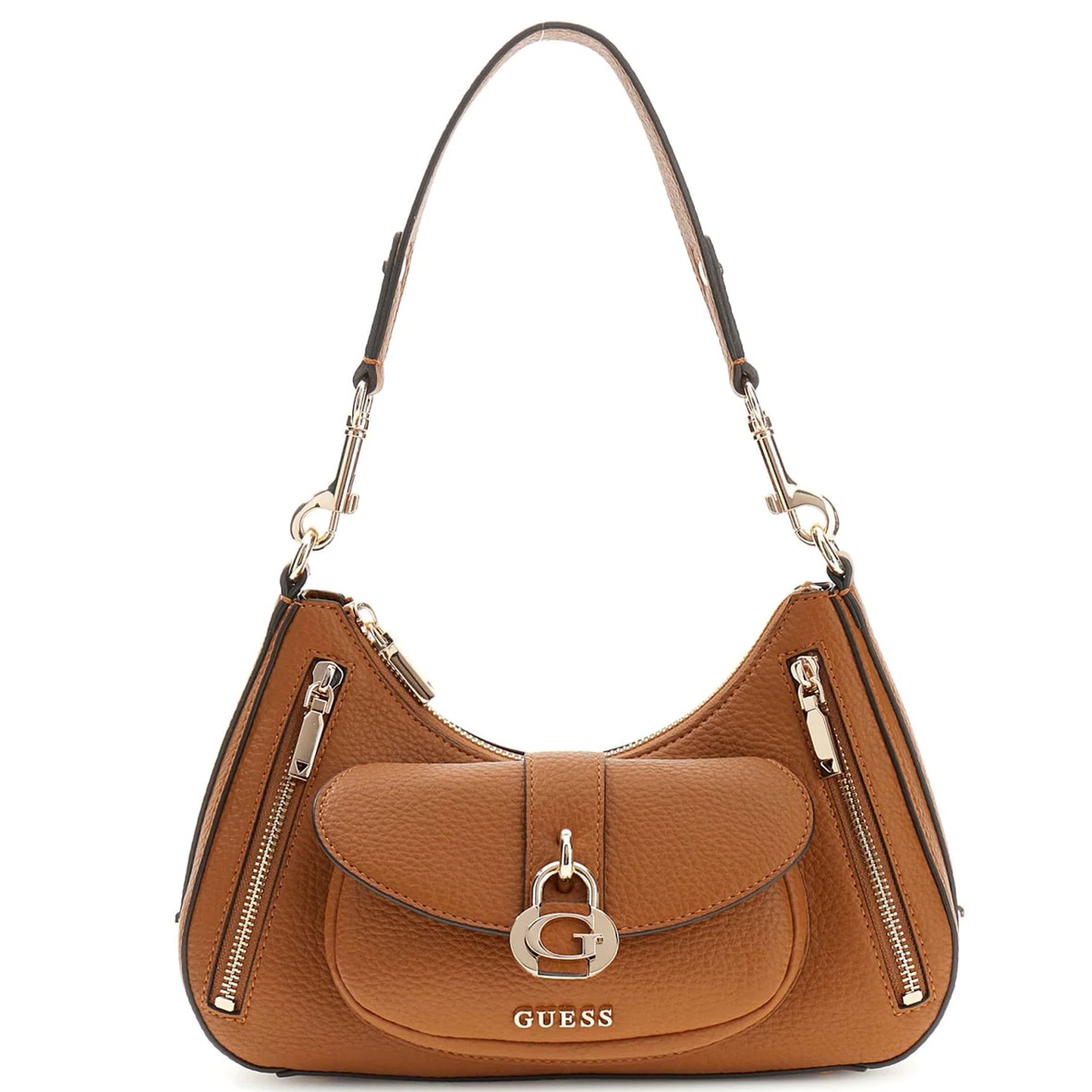 Apresenta 1 pega de ombro amovível, 4 bolsos exteriores, 1 bolso interior, espaços interiores para cartões, fecho de correr, pés protetores e logótipo, ideal para o uso diário com praticidade e organização.
