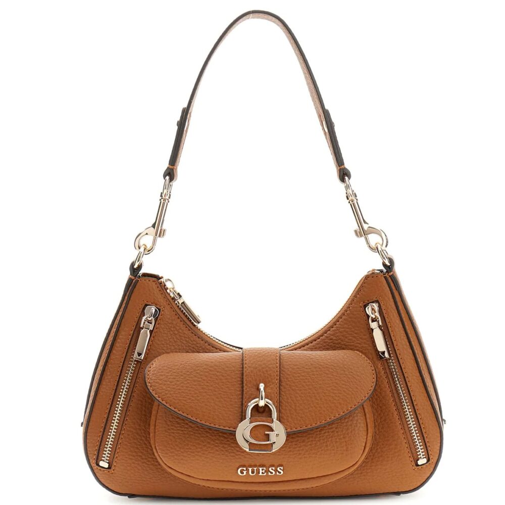 Apresenta 1 pega de ombro amovível, 4 bolsos exteriores, 1 bolso interior, espaços interiores para cartões, fecho de correr, pés protetores e logótipo, ideal para o uso diário com praticidade e organização.