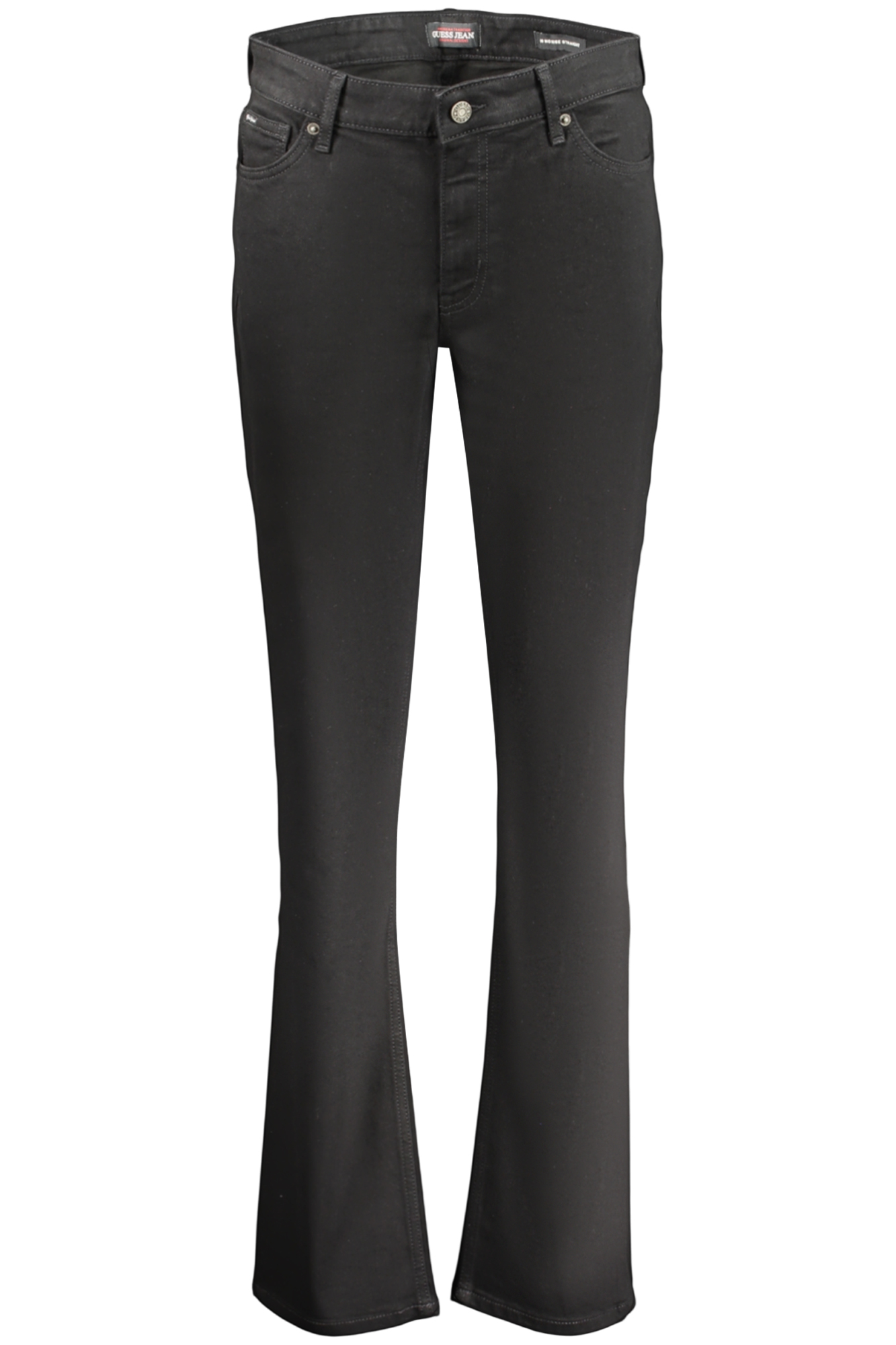 • Detalhes: Configuração tradicional de 5 bolsos, fecho de correr frontal com botão metálico e passadores para cinto.