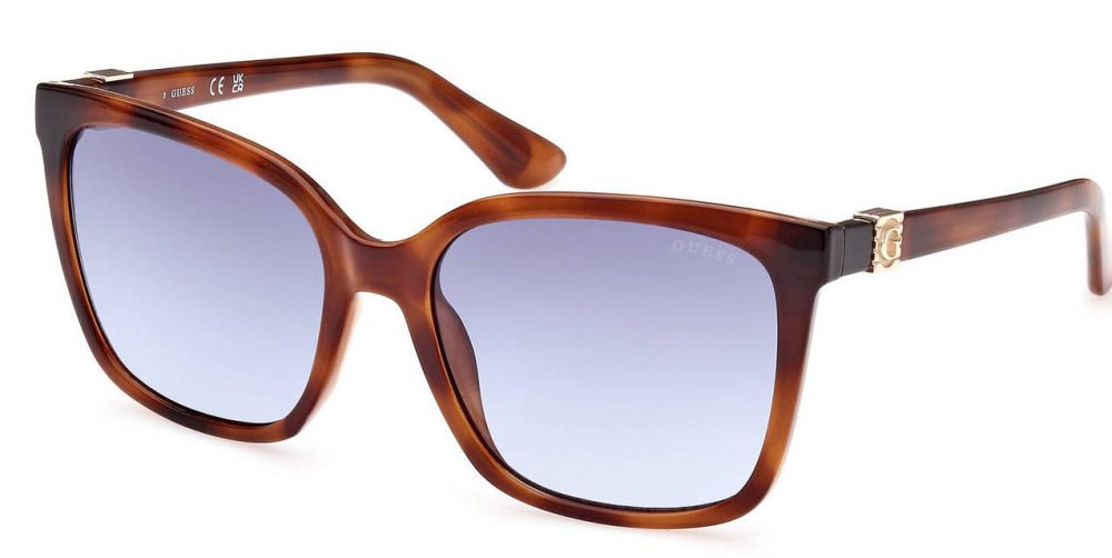 óculos de sol, armação em plástico injetado, lente quadrada, lente azul clara, detalhes contrastantes, largura da lente 57 mm, largura da ponte 18 mm, comprimento da haste 140 mm, logótipo