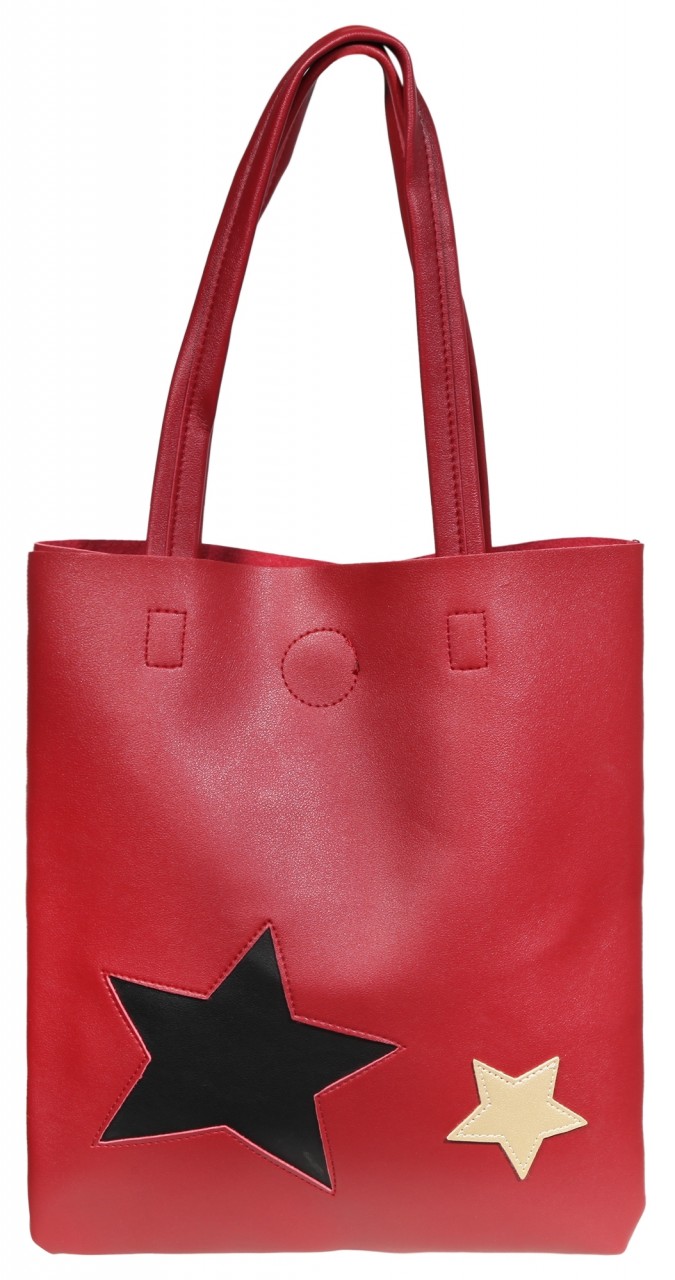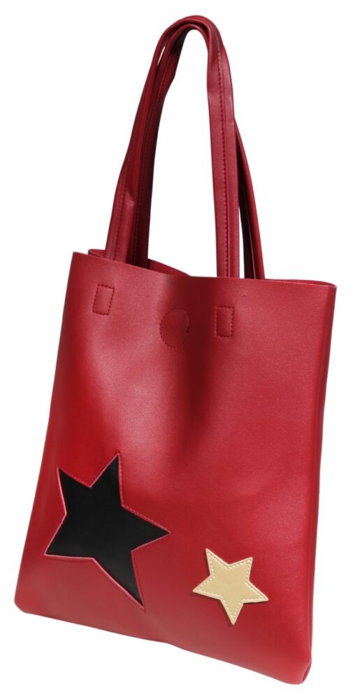 A mala de mão é uma mala feminina em pele sintética. Toda a superfície tem uma textura lisa e está disponível em preto, prateado, vermelho e cinzento. A bolsa tem duas pegas de transporte e um grande compartimento principal que pode ser aberto com um fecho magnético. No interior, existe um compartimento interior que pode ser fechado com um fecho de correr atrás das costas. A bolsa mede 5 cm de comprimento, 30 cm de largura e 33 cm de altura.