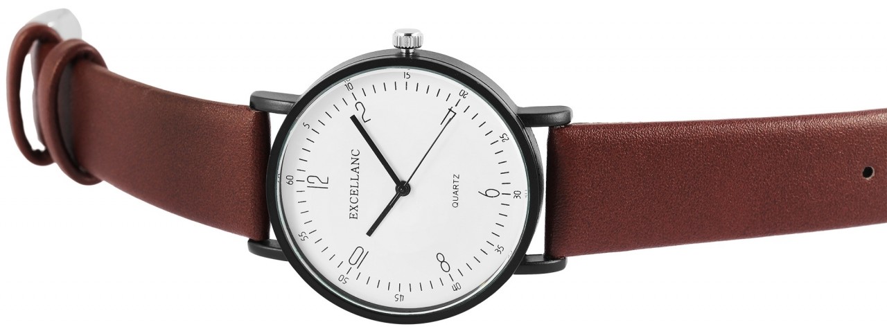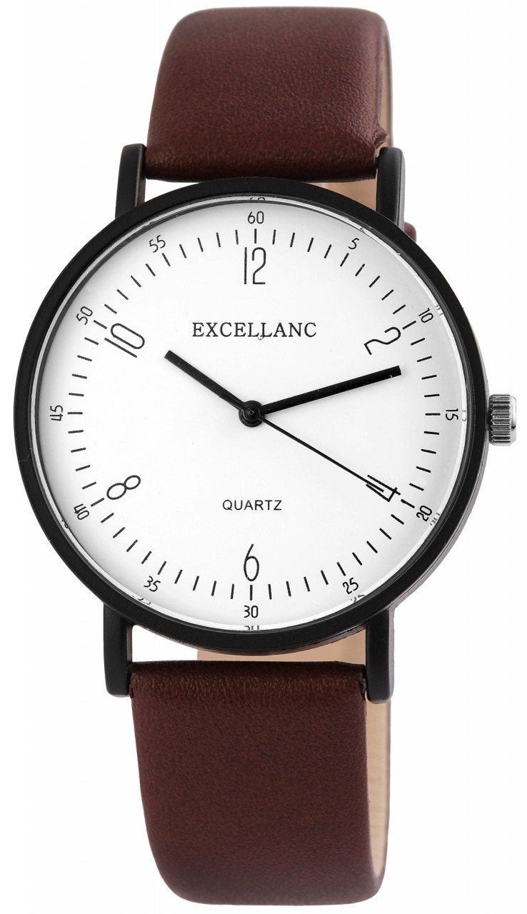 O relógio de pulso analógico masculino de 3 ponteiros da Excellanc possui um movimento de quartzo de alta qualidade. A pulseira em pele genuína tem 20 mm de largura na alça e pode ser aberta e fechada com uma fivela. O comprimento total do relógio é de 24,5 cm. A caixa de metal com vidro mineral tem um diâmetro de 41 mm e uma altura de 9 mm. O mostrador é simples e possui índices e ponteiros prateados. Um destaque visual deste relógio é a coroa, que, ao contrário de outros relógios, não está colocada na posição das três horas, mas sim nas quatro horas. O fundo da caixa é feito de aço inoxidável. Um relógio de estilo clássico que pode ser combinado com qualquer estilo de roupa.