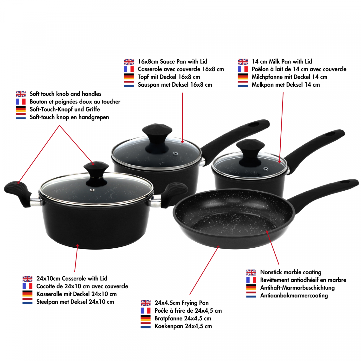 - Conjunto completo: O conjunto inclui peças essenciais para uma variedade de necessidades culinárias: uma panela de 16×8 cm com tampa, uma panela de leite de 14 cm com tampa, uma caçarola de 24×10 cm com tampa e uma frigideira de 24×4,5 cm, oferecendo uma solução completa para as tarefas diárias de cozinha.