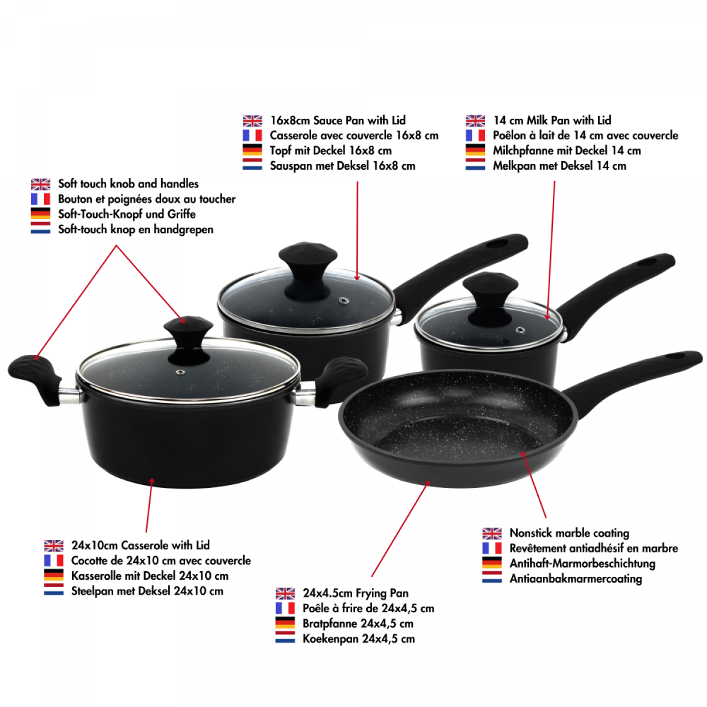 - Conjunto completo: O conjunto inclui peças essenciais para uma variedade de necessidades culinárias: uma panela de 16×8 cm com tampa, uma panela de leite de 14 cm com tampa, uma caçarola de 24×10 cm com tampa e uma frigideira de 24×4,5 cm, oferecendo uma solução completa para as tarefas diárias de cozinha.