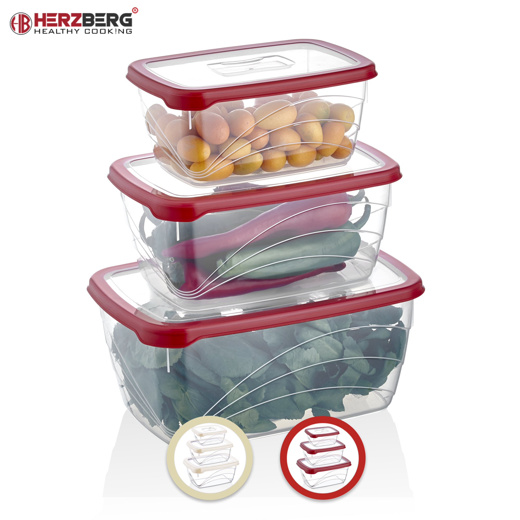 3 tamanhos de recipientes e tampas de cores correspondentes