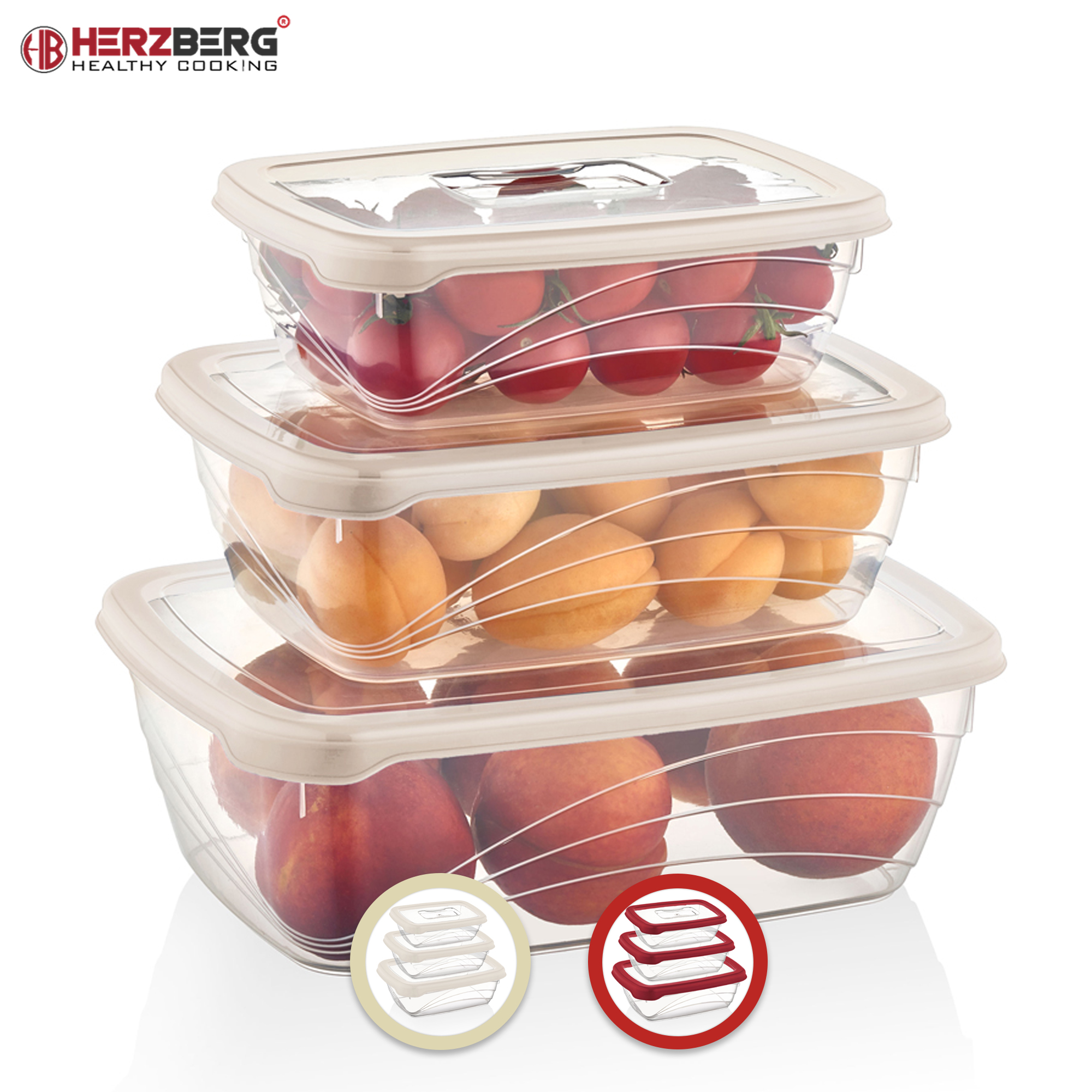 3 tamanhos de recipientes e tampas de cores correspondentes