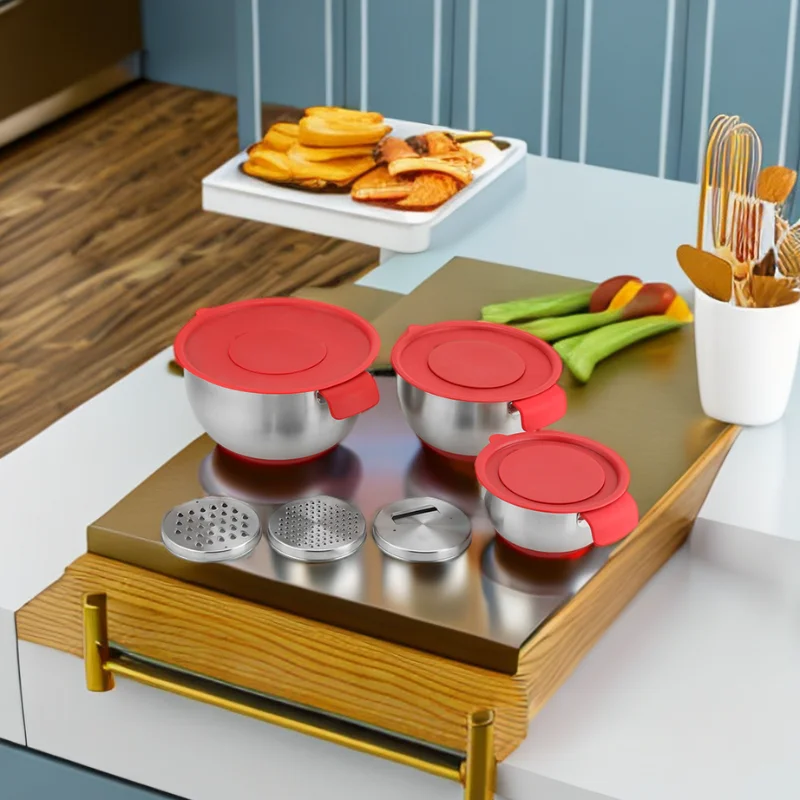 Não apenas tigelas comuns, nosso conjunto vem com três práticos raladores que cabem perfeitamente na tampa da tigela maior. Fabricados em aço inoxidável, esses acessórios para ralador cortam, desfiam e ralam sem esforço, facilitando a preparação dos alimentos e mantendo seu espaço de trabalho limpo e arrumado. Além disso, cada tigela possui um fundo plano de silicone antiderrapante, garantindo estabilidade durante a agitação, mistura ou batida e reduzindo o risco de derramamentos e sujeira.
