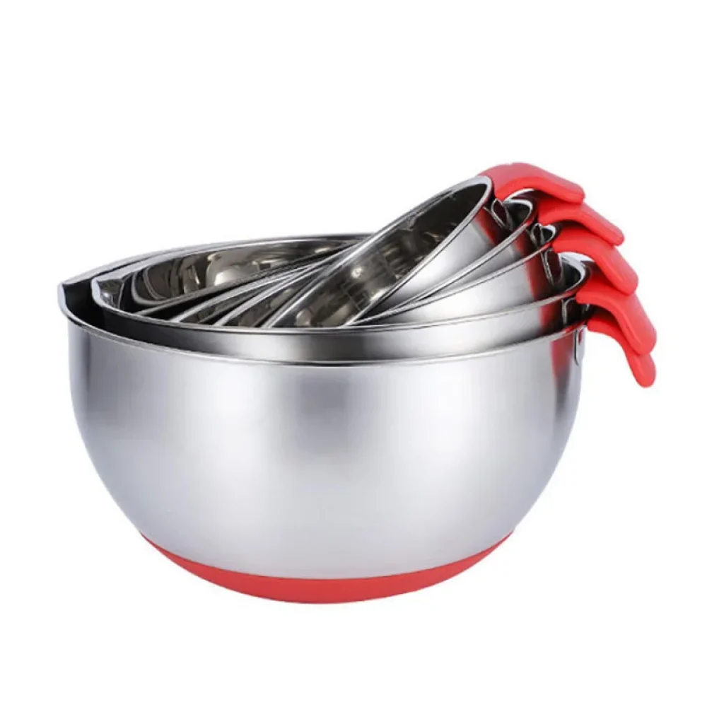 - Alças ergonômicas de silicone: Essa característica destaca a inclusão de alças de silicone nas tigelas, que são projetadas para proporcionar uma pegada confortável e segura, mesmo no manuseio de ingredientes quentes ou pesados, garantindo segurança e facilidade de uso ao usuário.