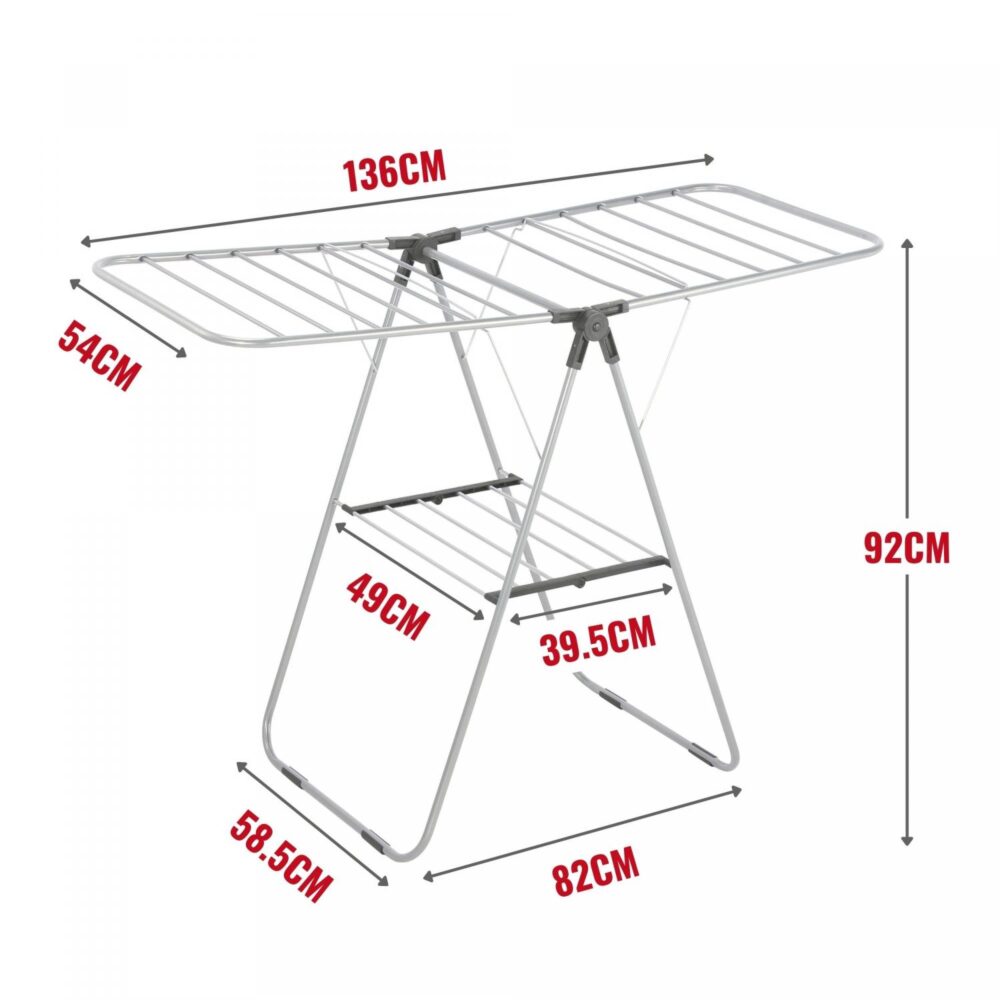 Desfrute de um espaço de secagem espaçoso com o design de 2 camadas e 2 asas, proporcionando amplo espaço para vários itens, desde roupas a chinelos e toalhas de banho. As dimensões, incluindo uma envergadura de 136 cm x 54 cm, altura de 92 cm, camada inferior de 49 cm x 39,5 cm e uma dimensão de base de 58,5 cm x 82 cm, oferecem versatilidade para as suas necessidades de secagem.
