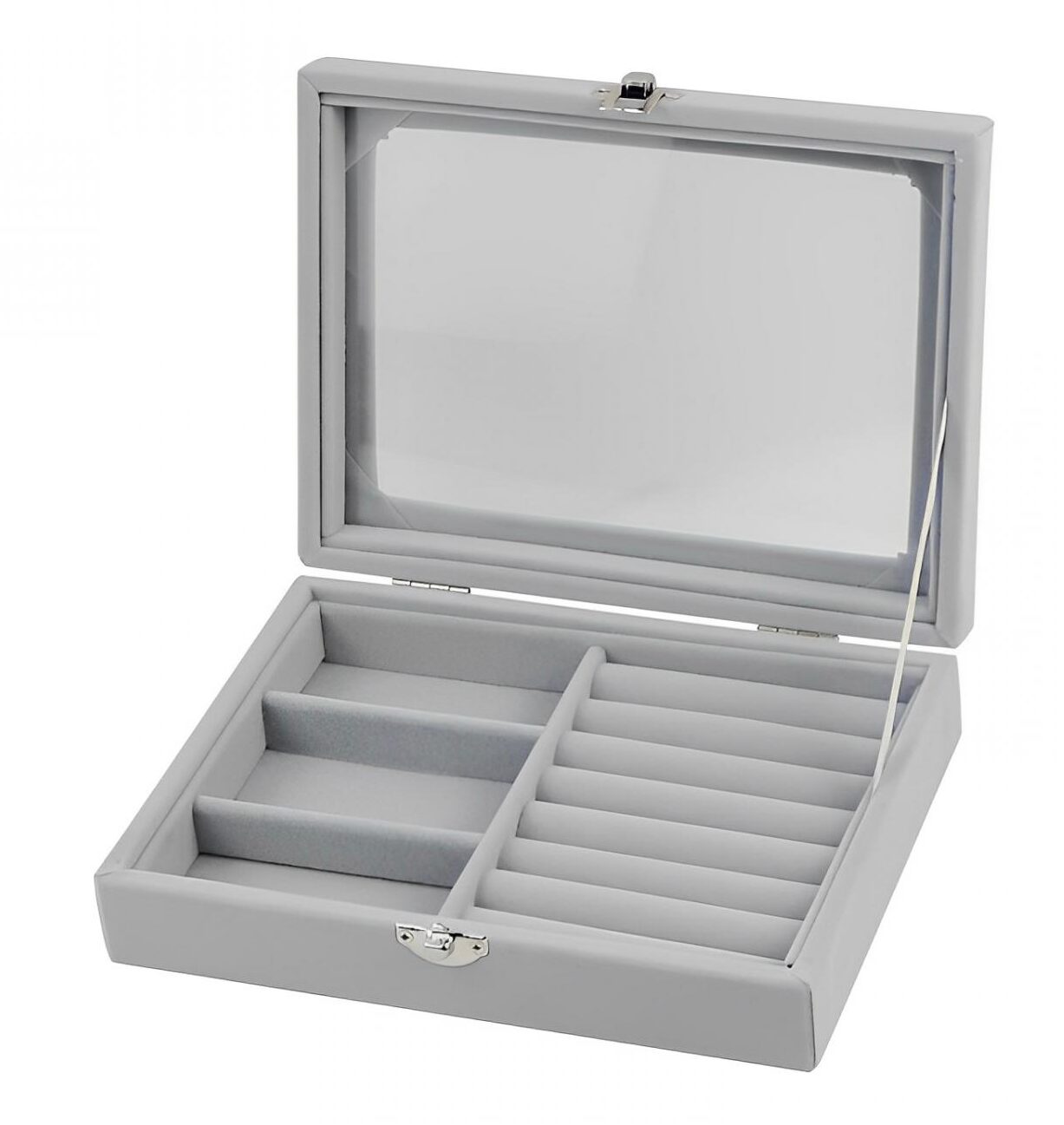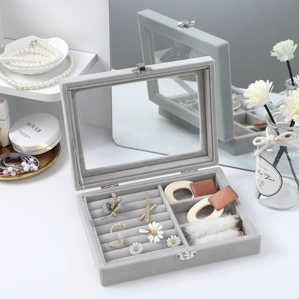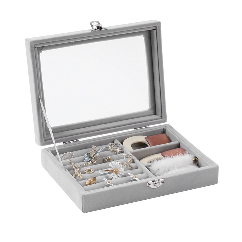 - Veludo + Tampa de Vidro: A combinação de um exterior de veludo macio e uma tampa de vidro transparente oferece um visual luxuoso, mantendo suas joias protegidas de poeira e detritos. A tampa de vidro também fornece uma visão clara de suas joias sem precisar abrir a caixa.