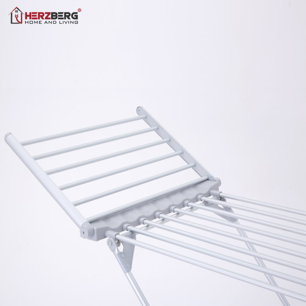 Chega de mofo ou odor desagradável em roupas recém-lavadas em dias chuvosos. A Herzberg apresenta o HG-8069, um secador de roupas elétrico com asas dobráveis. Feito de aço de alta qualidade, acabamento em revestimento em pó resistente ao calor para fornecer uma superfície não corrosiva e sem ferrugem, ao mesmo tempo em que oferece uma aparência limpa e combina e se adapta a qualquer decoração. Este varal elétrico para secar roupas tem um tubo de aquecimento de 20 controlado por um termostato confiável para oferecer calor sustentável e seguro para todos os seus tecidos. O design independente permite que você mova o varal para qualquer lugar da casa. Com construção robusta e resistente, essas roupas elétricas podem suportar 15 kg de roupas, incluindo a asa extensível. Além de ter um design moderno, inovador e prático, também é altamente eficiente, oferecendo 120 W de potência de desumidificação e secagem, podendo secar toalhas em 2 horas e camisas normais em horas. Este mecanismo simples pode proporcionar grande conveniência para você e sua família, ao mesmo tempo em que protege suas roupas de bactérias e mofos. Este varal elétrico para secar roupas é alimentado por uma tomada elétrica padrão e produz apenas 8 dB de ruído, permitindo que você tenha um sono interrompido enquanto seca suas roupas em seu quarto. Não só oferece uma solução prática para toda a sua lavanderia, nossa principal prioridade é sua segurança durante o uso. Todos os tubos de aquecimento são seguros para tocar e produzem uma temperatura constante.