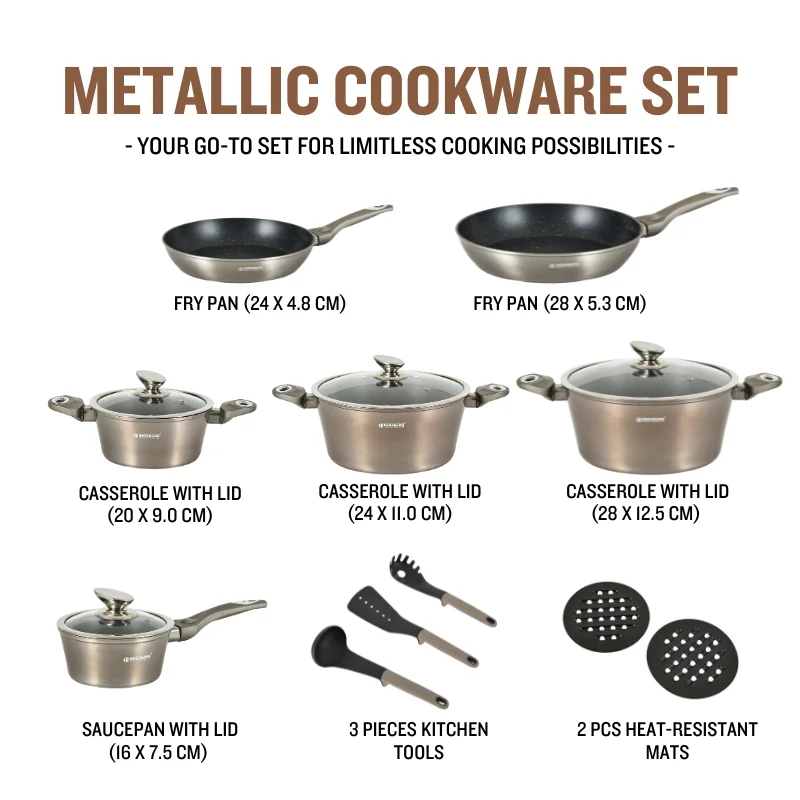 Mais do que apenas funcional, o conjunto HG-METCR15 destaca-se com o seu elegante exterior em tom de cobre, dando à sua cozinha um apelo quente e moderno. Os utensílios de cozinha incluídos combinam perfeitamente com a cor e são ergonomicamente concebidos para conforto e controlo. Com a proteção adicional de dois tapetes térmicos em baquelite, pode passar do fogão para a mesa com facilidade. Quer esteja a preparar refeições diárias ou a entreter convidados, este conjunto de panelas proporciona um equilíbrio perfeito entre durabilidade, desempenho e estilo intemporal.