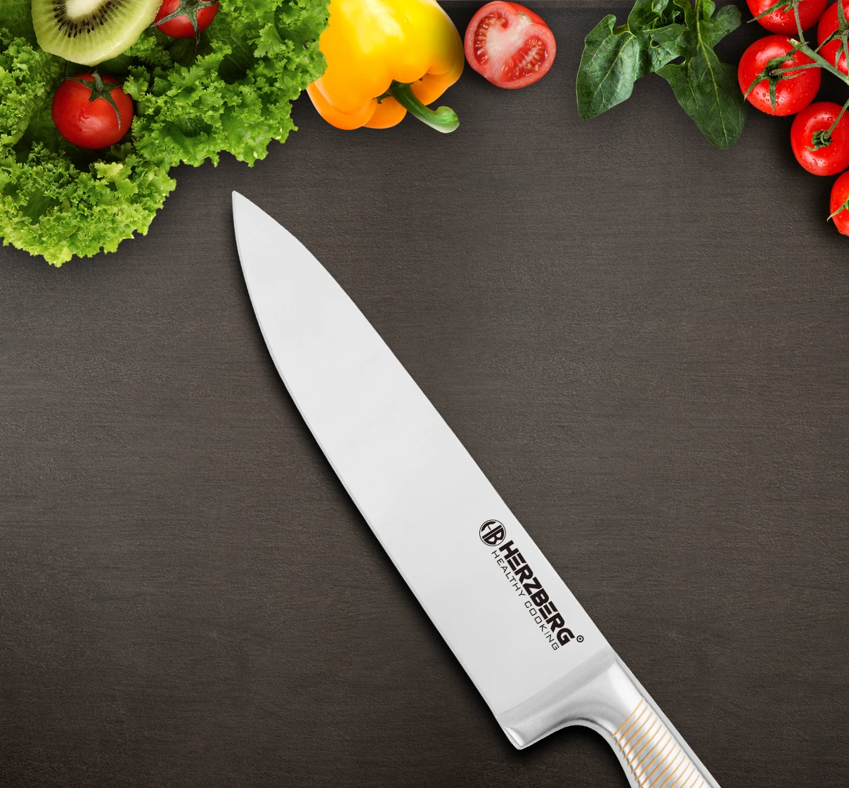 To keep your knives organized and within easy reach, the set is housed in a rotating acrylic stand that provides both practicality and style. The transparent design allows you to see each knife clearly, while the rotating feature ensures easy access to your tools at all times. Whether you're a home cook or a professional chef, the Herzberg HG-SKN 8-Piece Knife Set is designed to enhance your culinary experience, offering the perfect balance of durability, efficiency, and aesthetic appeal.