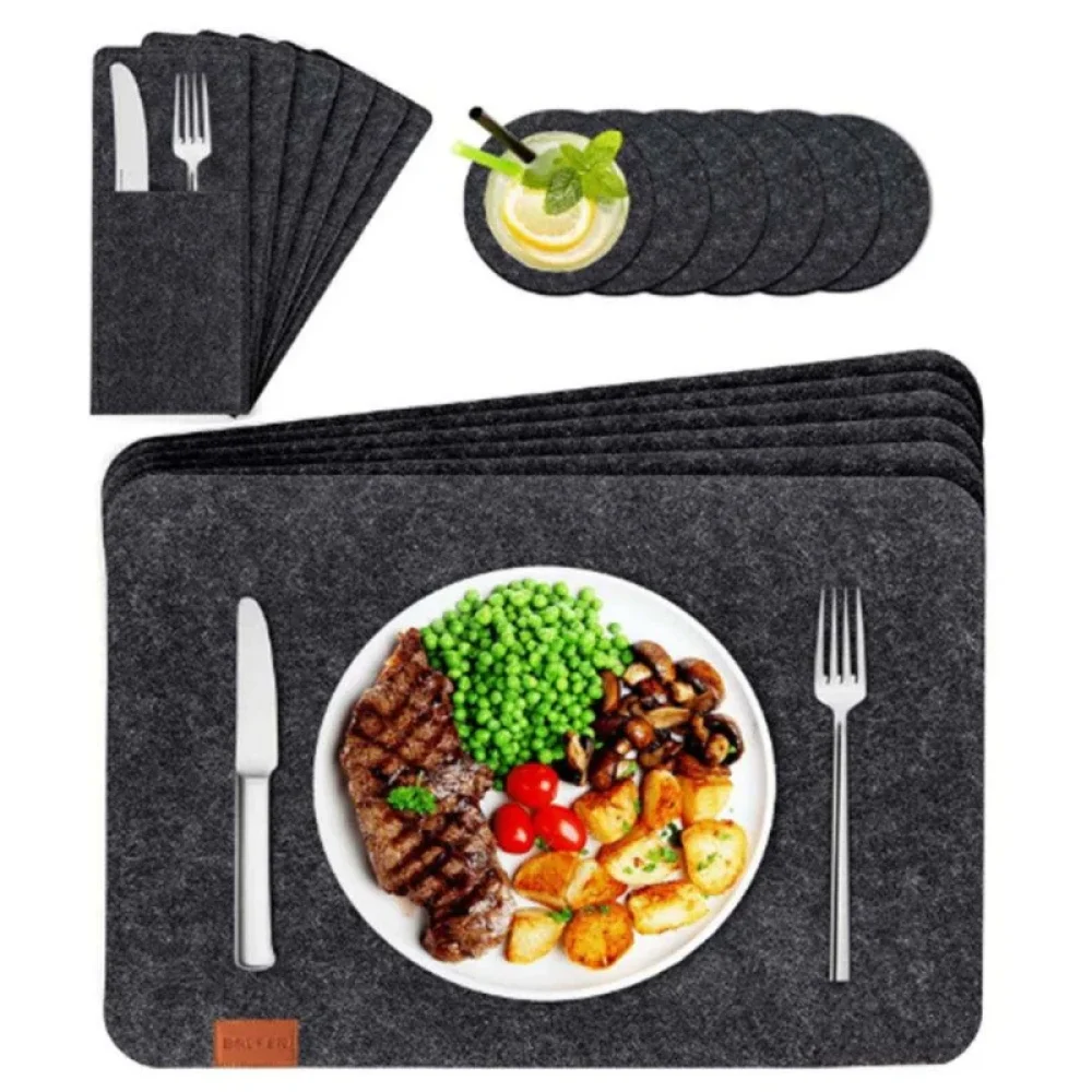 • Material de qualidade premium: esse recurso destaca que os jogos americanos e porta-copos são confeccionados em feltro de alta qualidade, conhecido por sua durabilidade e resiliência. A espessura de 5 mm garante uma construção robusta que pode suportar o uso diário sem se desgastar facilmente, proporcionando proteção a longo prazo contra manchas e arranhões.