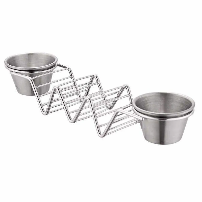Apresentando o suporte para taco de aço inoxidável Herzberg com 2 xícaras de molho, feito para entusiastas de taco que buscam a solução perfeita para servir. Feito de aço inoxidável de qualidade premium, este suporte para taco pode ser levado ao forno, permitindo que você mantenha seus tacos quentes e crocantes. Com sua construção durável em aço inoxidável 304, esta bandeja para taco foi projetada para suportar os rigores do uso diário sem enferrujar, entortar ou quebrar.